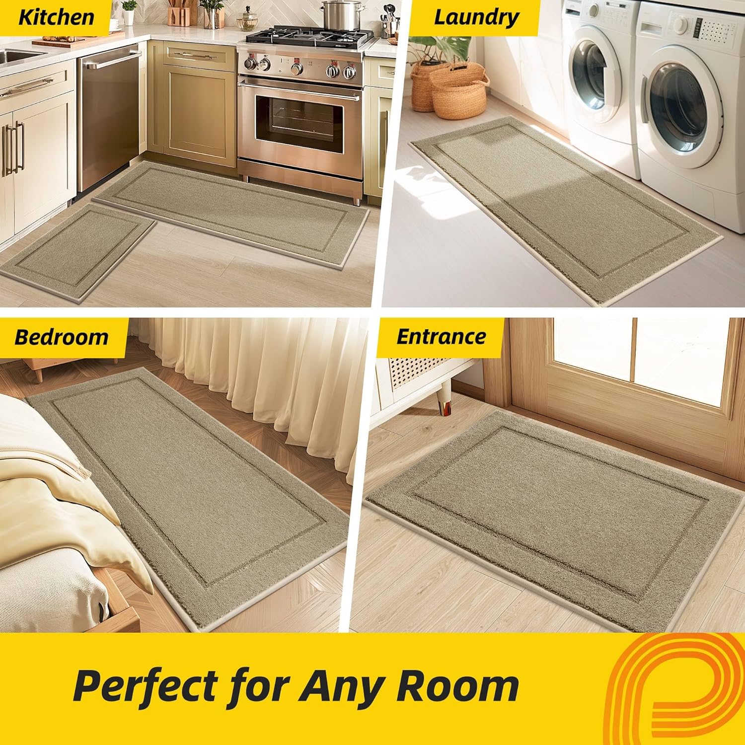 JSEI Non-Slip Kitchen Mats, Self Adhesive No Sliding Kitchen Rugs Set of 2, Washable Absorbent Floor Mat for Kitchen, Bathroom, Laundry Room, Bedroom, 24”x36”+24”x60”, Beige, Rectangular Pattern