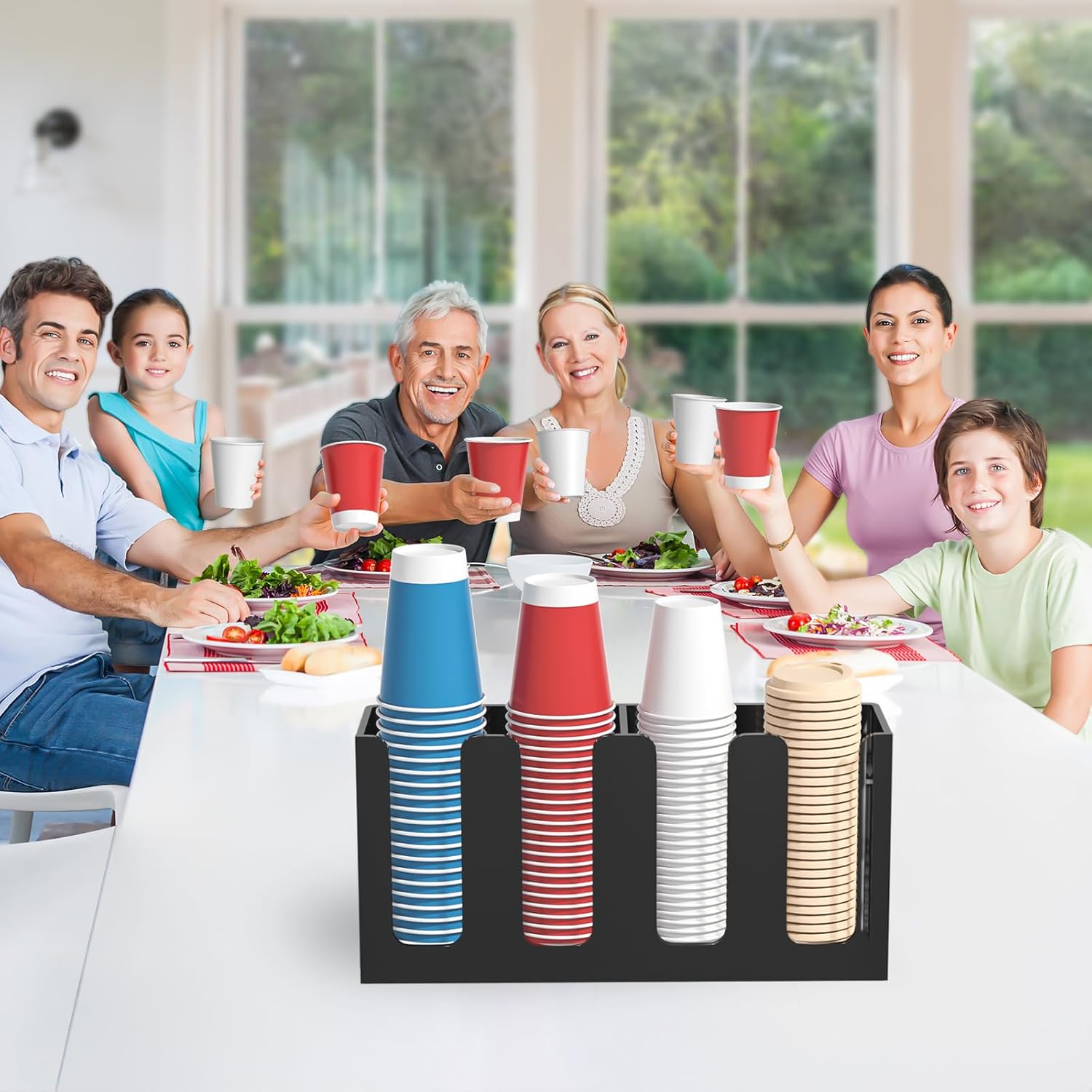 - INTEGRATED HANDLES: with a more user friendly design of 2 cutouts on two sides to be used as handles to carry around when you need to move this disposable paper cup holder from kitchen countertop in a house party or BBQ in your garden yard, it's great for in-home use or picnics
