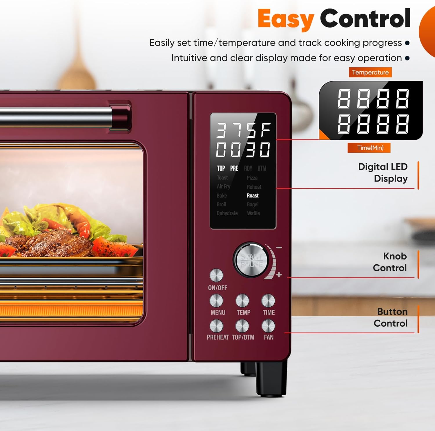 - 12 PRE-PROGRAMMED PRESETS - This premium 1800-watt toaster oven and air fryer features 12 functions: Air Fry, Grill, Bake, Reheat, Bagel, Pizza, Toast, Broil, Waffle, Dehydrate, Frozen and Keep Warm, all in one powerful appliance.