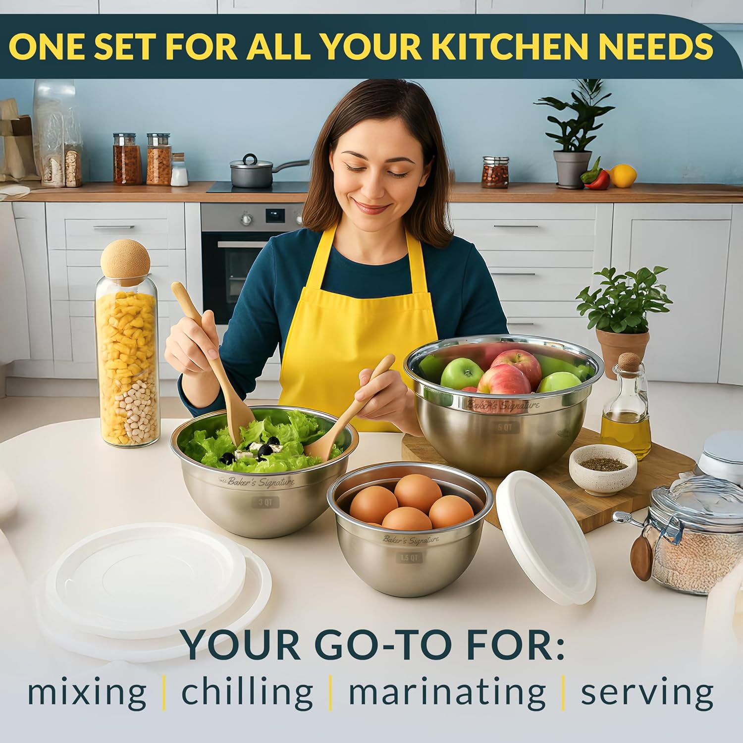 - DURABLE & LIGHTWEIGHT: Strong enough for daily use yet light enough to handle easily, this mixing bowl set features stainless steel bowl lid protection and is dishwasher safe (except lids).