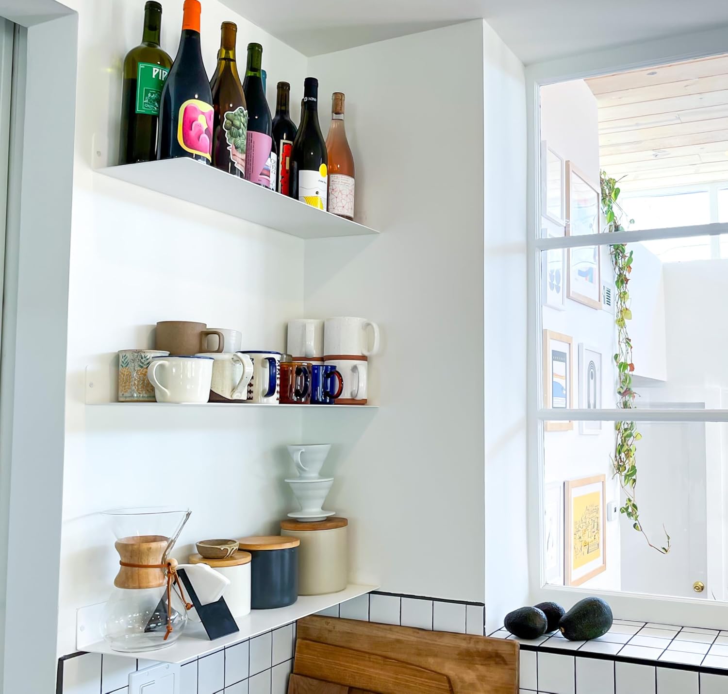 - DIMENSIONS & DETAILS: Measuring 30-inches long x 8-inches in depth, our steel floating shelf is made from 14 gauge raw steel and professionally powder coated white. The weight of the shelf is 6.5 LBS. It's perfect for displaying books, plants, bottles, picture ledges, and retail displays