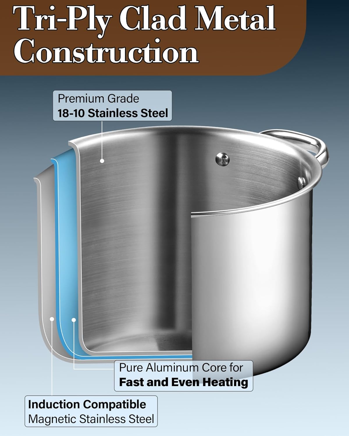 - Tri-Ply Clad: 4 quart stockpot is made of 18/10 stainless steel inner layer, aluminum core and megnetic stainless steel outer layer, which ensures good thermal conductivity and even heat distribution, helping food heat up quickly and evenly