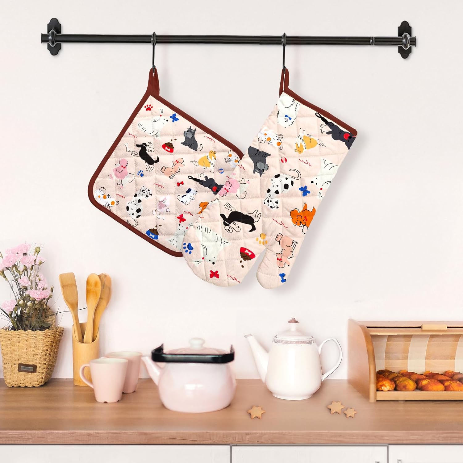 Dogs Oven Mitts and Pot Holders Sets 2Pcs, 100% Cotton Heat Resistant, Extra Long Oven Gloves Potholder for Kitchen Cooking Baking Decoration