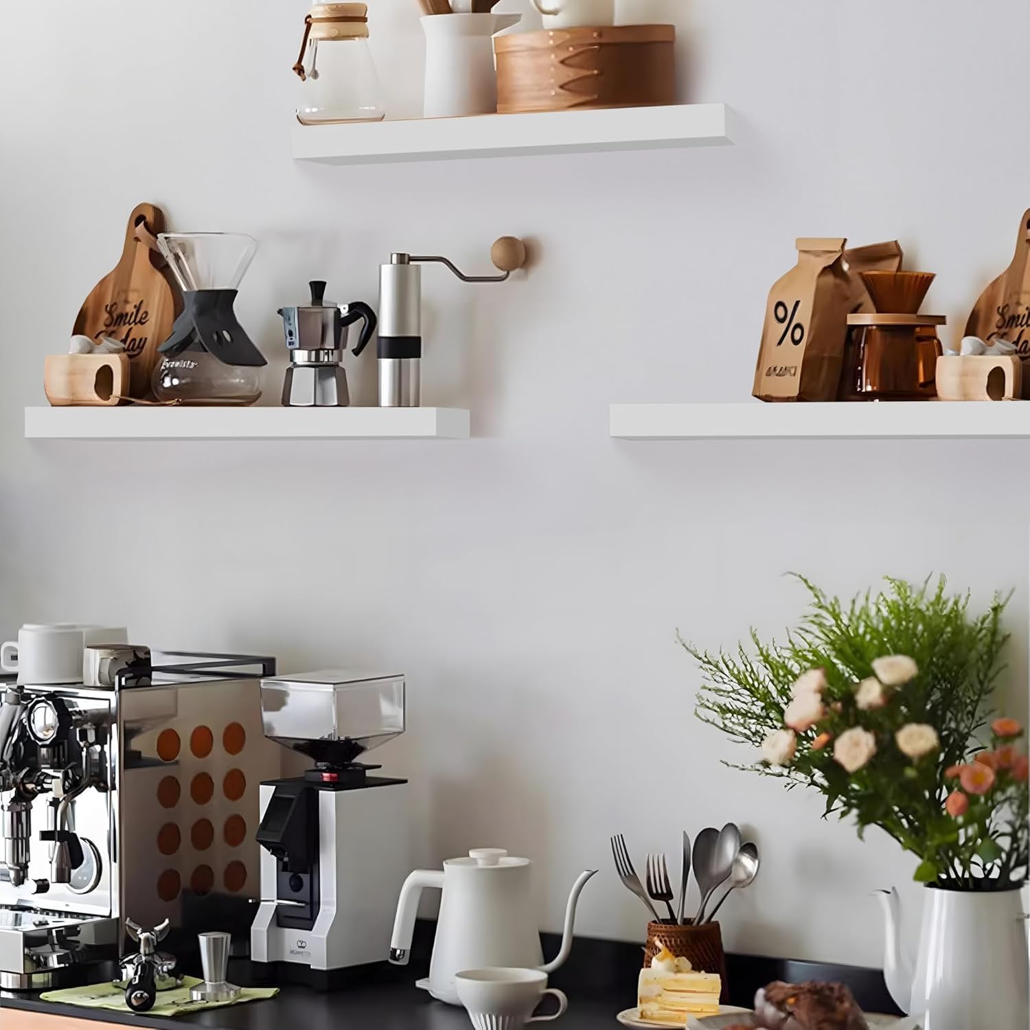 - STRONG AND DURABLE: Crafted from high-quality materials, these kitchen wall shelves are 1.3 inches thick and 11 inches wide, capable of holding up to 50 pounds. Solid brackets ensure no sagging or wobbling, providing reliable support for your favorite items.
