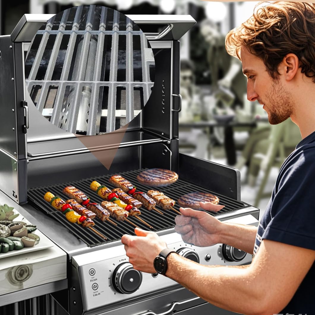 - Product Dimensions And Materials: Cast iron cooking grates Cast Iron Cooking Grates 16 4/9 x 9 1/4" each, 16 4/9 x 27 3/4" Total