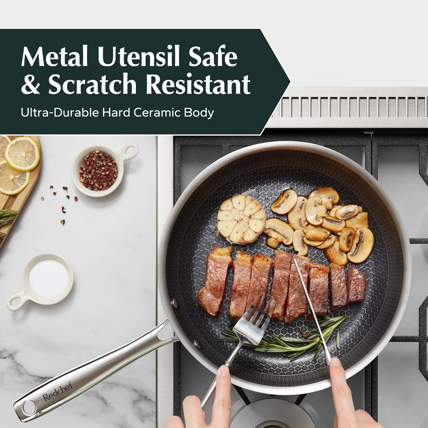 - SUPER NONSTICK: Redchef frying pans nonstick combines a honeycomb structure with a healthy ceramic coating for dual nonstick performance. Effortless food release and easy cleanup make cooking enjoyable. Perfect for frying eggs or sautéing vegetables with minimal oil