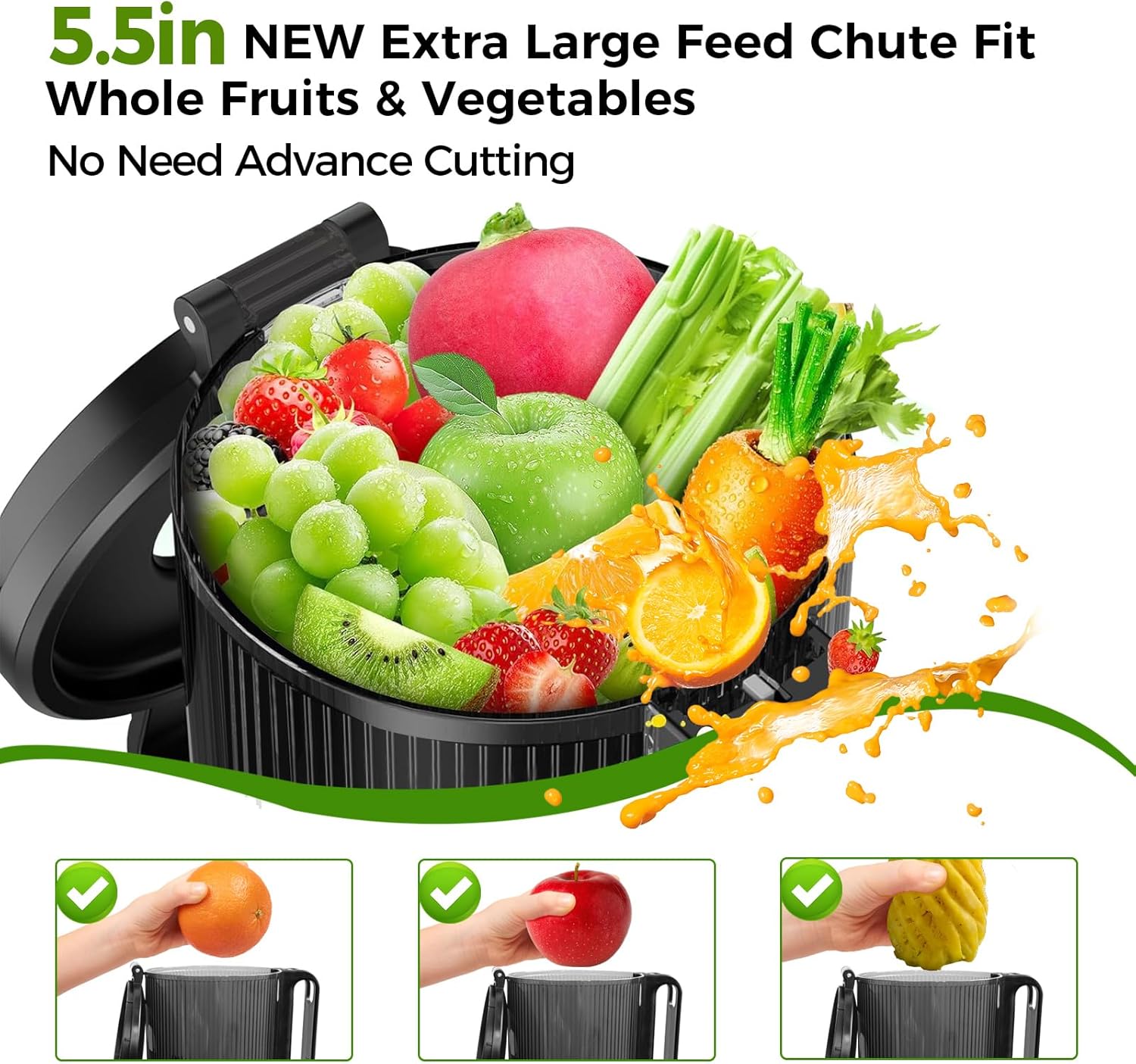 - ăJuicer Machines for Whole Fruits and Vegetablesă: Our Cold Press Juicer Fully Upgraded 5.5-Inch Feed Chute Is More Larger Than Normal, 60oz supports whole fruit juicing, Allowing You to Add Whole-Sized Fruits and Vegetables Without Chopping Them Up. saving time and effort, Juice More with Ease.