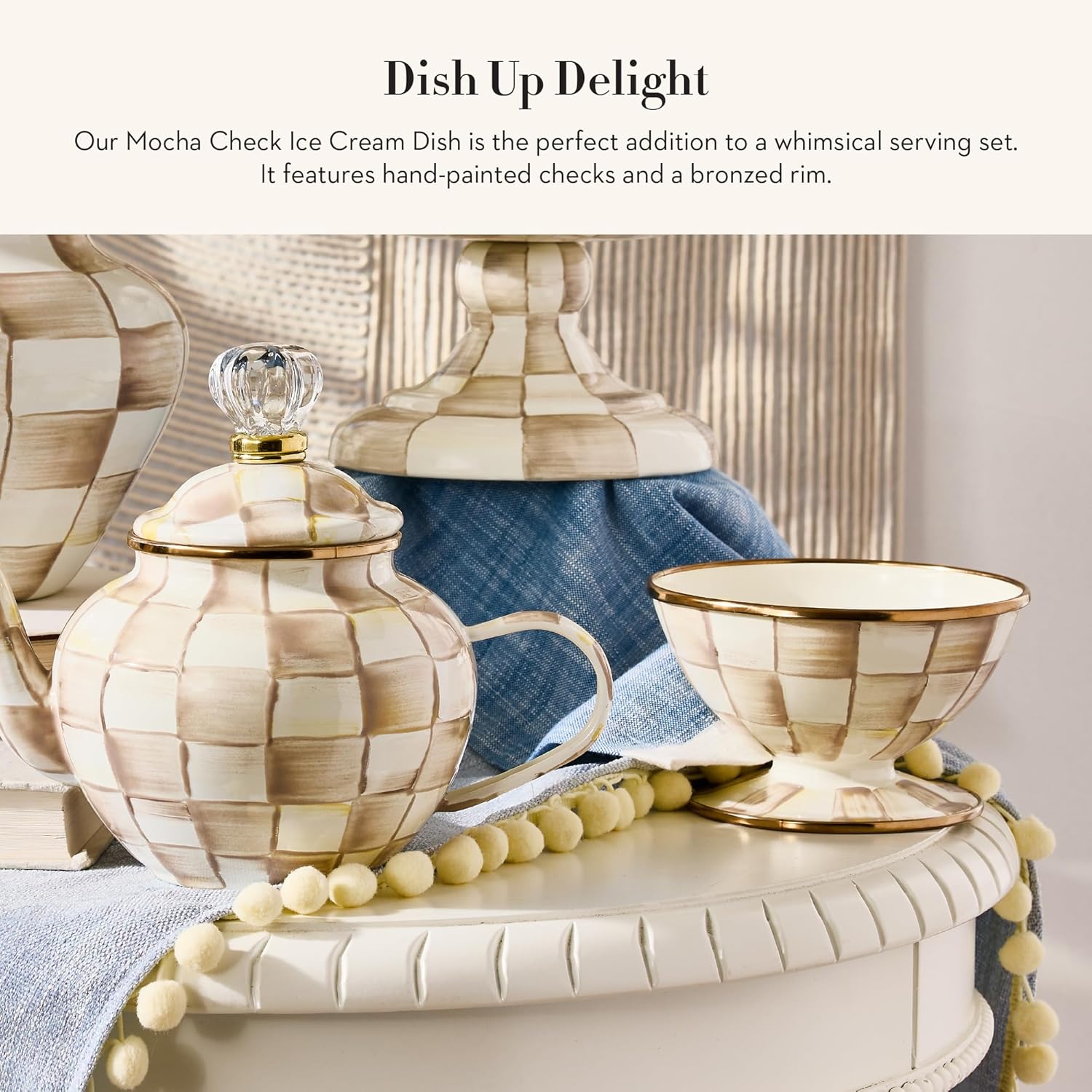 MACKENZIE-CHILDS Enamel Ice Cream Bowl, Serving Bowls for Entertaining, 2-Cup Capacity, Brown-and-White Mocha Check