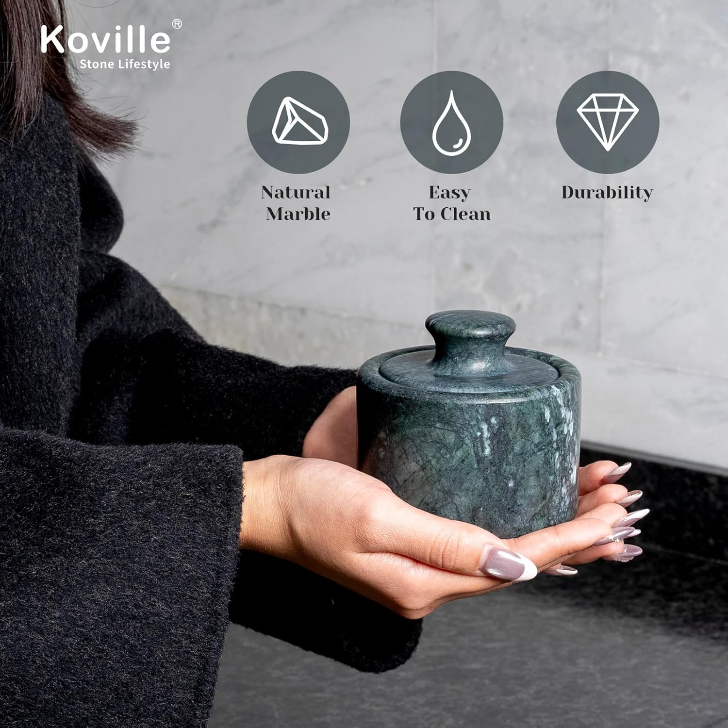 - Handcrafted from 100% Indian Green Marble Carefully carved from high-quality Indian green marble, known for its rich emerald tones and white-gold veining. Each jar is a natural work of art—no two are the same—offering a timeless aesthetic that elevates any kitchen or dining decor