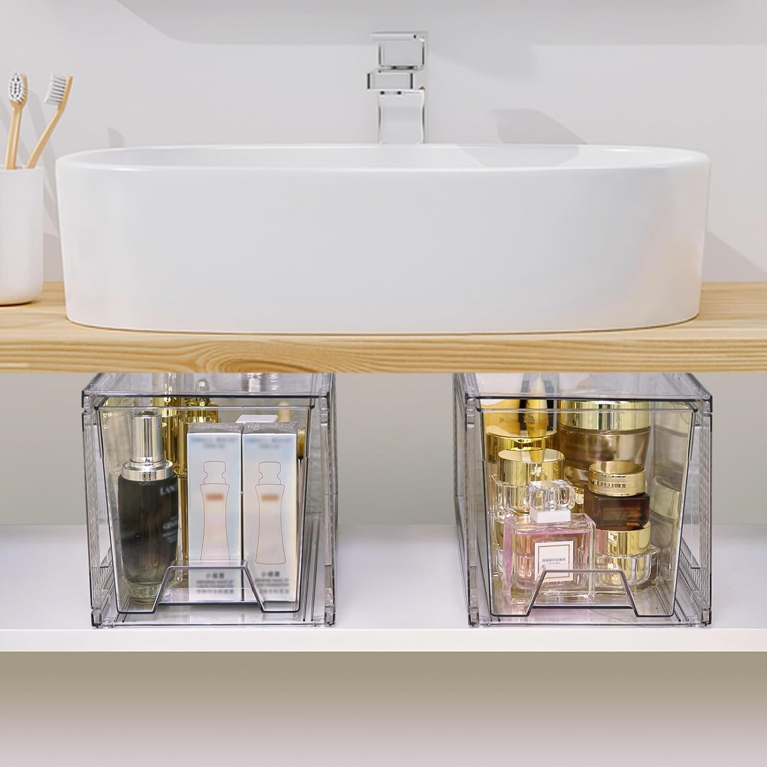 JollyPack 2 Pack Clear Stackable Storage Drawers, Easy to Assemble Multi-Use Bathroom Organizers and Storage, Suitable for Vanity, Bathroom, Makeup, Under Sink, Office, Kitchen and Pantry