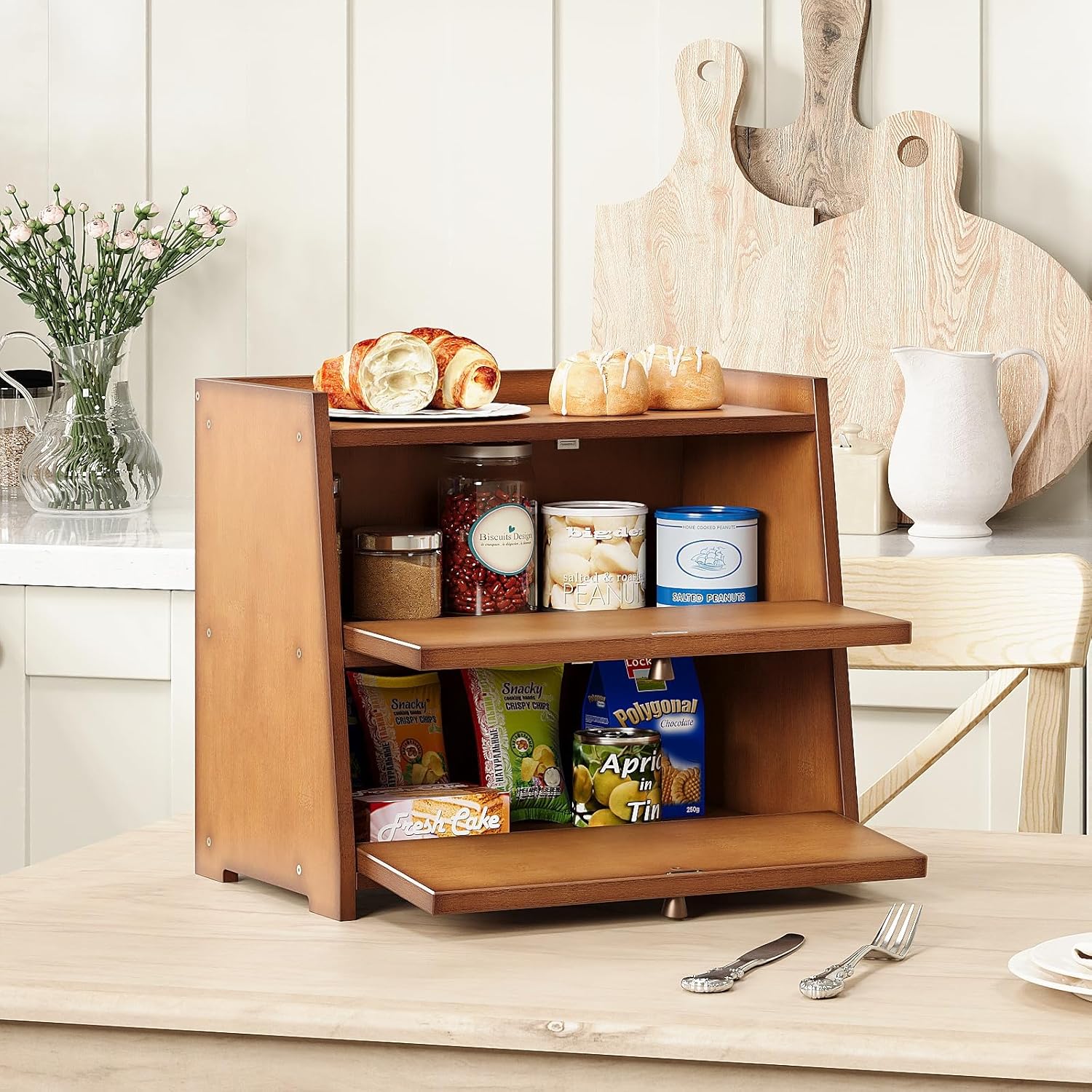 Vintage Double Layer Bread Box for Kitchen Counter Bamboo Bread Storage Container Large Capacity Bread Storage Bin