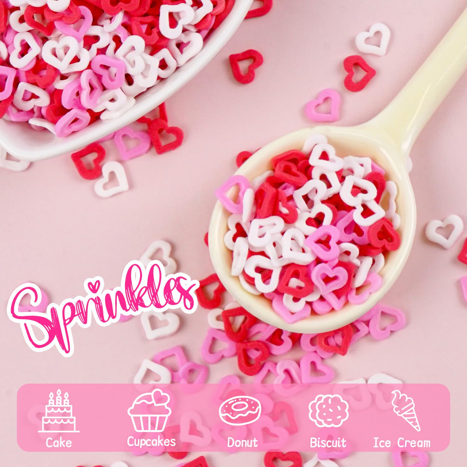 - Edible Hearts Sprinkles are a mix of white, red and pink. They can make your baking perfect and fun, and even beginners can easily use them. They can be used on cakes, cupcakes, waffles, cookies, and ice cream.