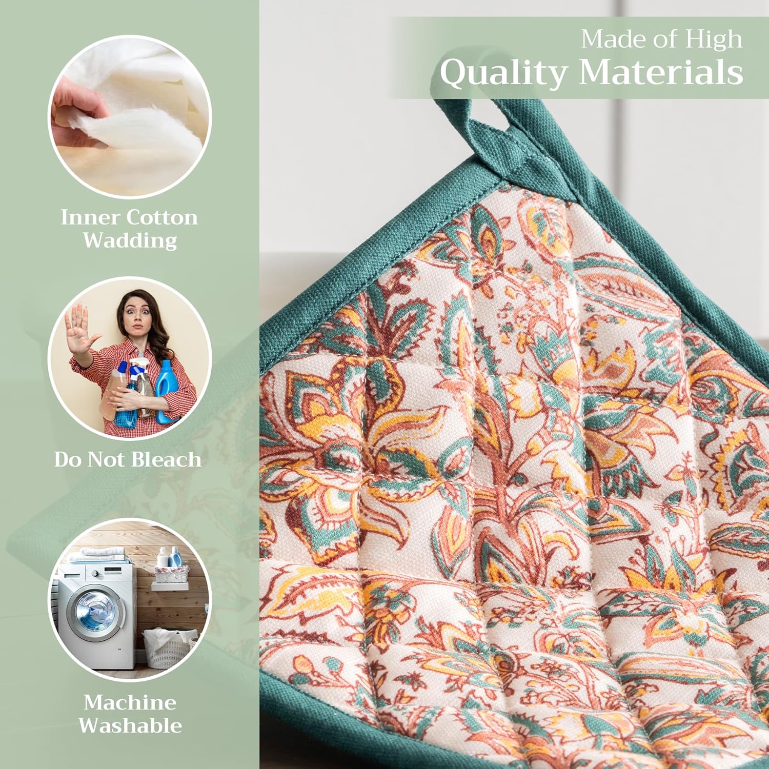 - 100% Quilted cotton: Made from premium quilted cotton, our pot holder ensures safe handling of hot pans or dishes. The soft, durable build provides excellent heat resistance and grip—perfect for everyday cooking and baking needs