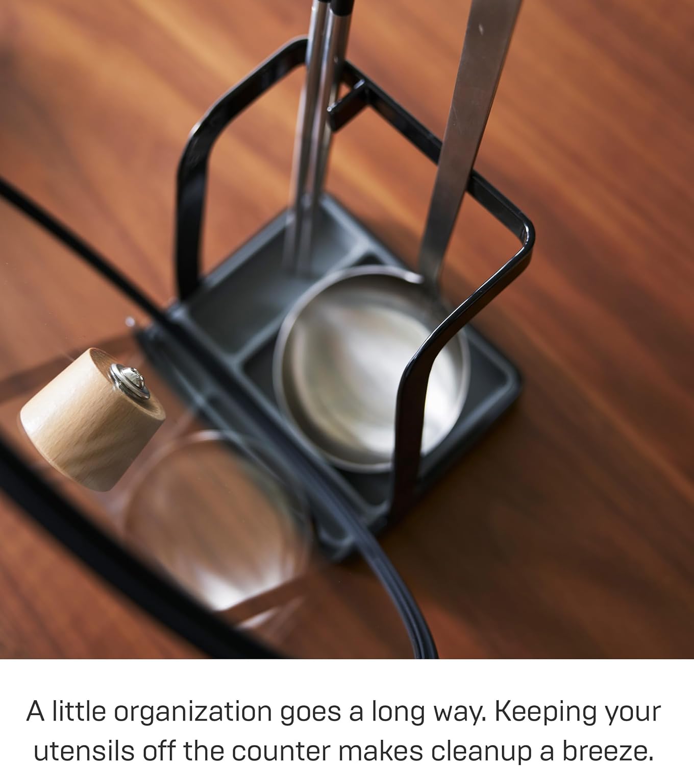 - [Upright organization] Special notches in the bottom tray help keep cooking utensils upright while front rest stablizes pot lids. The organizational bottom tray is also removable and dishwasher-safe for easy cleaning.