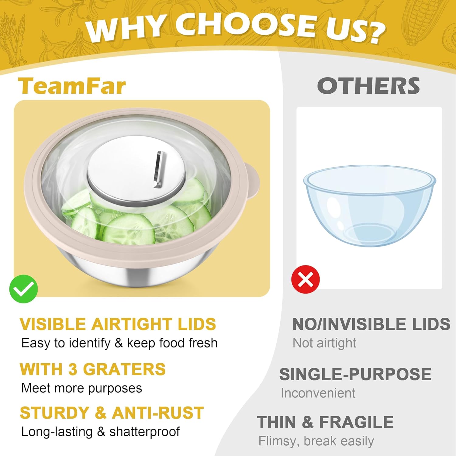- FOOD-SAFE & LONGEVITY: Our mixing bowls with lids and graters set is made of food grade stainless steel and non-toxic plastic lids, No harmful chemicals to ensure usersโ health and safety, Rust and chip resistant, Heavy duty construction make them not easy to break and deform, Stand the test of time and great for long-term use, A huge plus โ the bowls are oven safe except for the lids