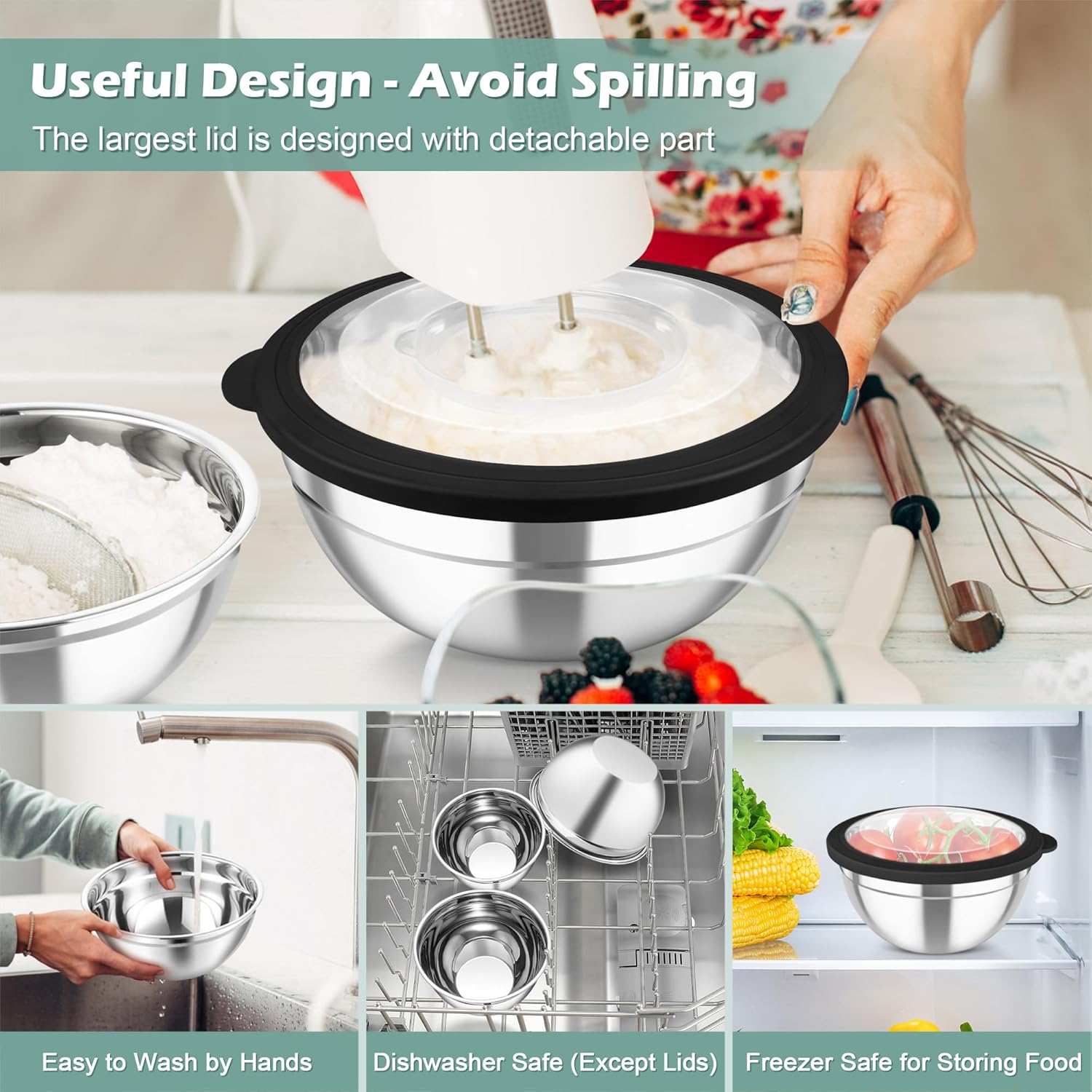 - TRANSPARENT LIDS & 3 GRATERS: Every stainless steel mixing bowl offers a visible clear tight-fitting lid, Easy to see through and identify whatโs in the bowl, Leak-proof to prevent liquid spills, Ideal for storing food in freezer to keep it fresh and clean, The largest lid has a detachable section, 3 grater attachments can be simply placed directly on the center of lid for slicing /grating /shredding, Practical for meal-preparing, No need to take away the entire lid to avoid splashing or spilling when whisking