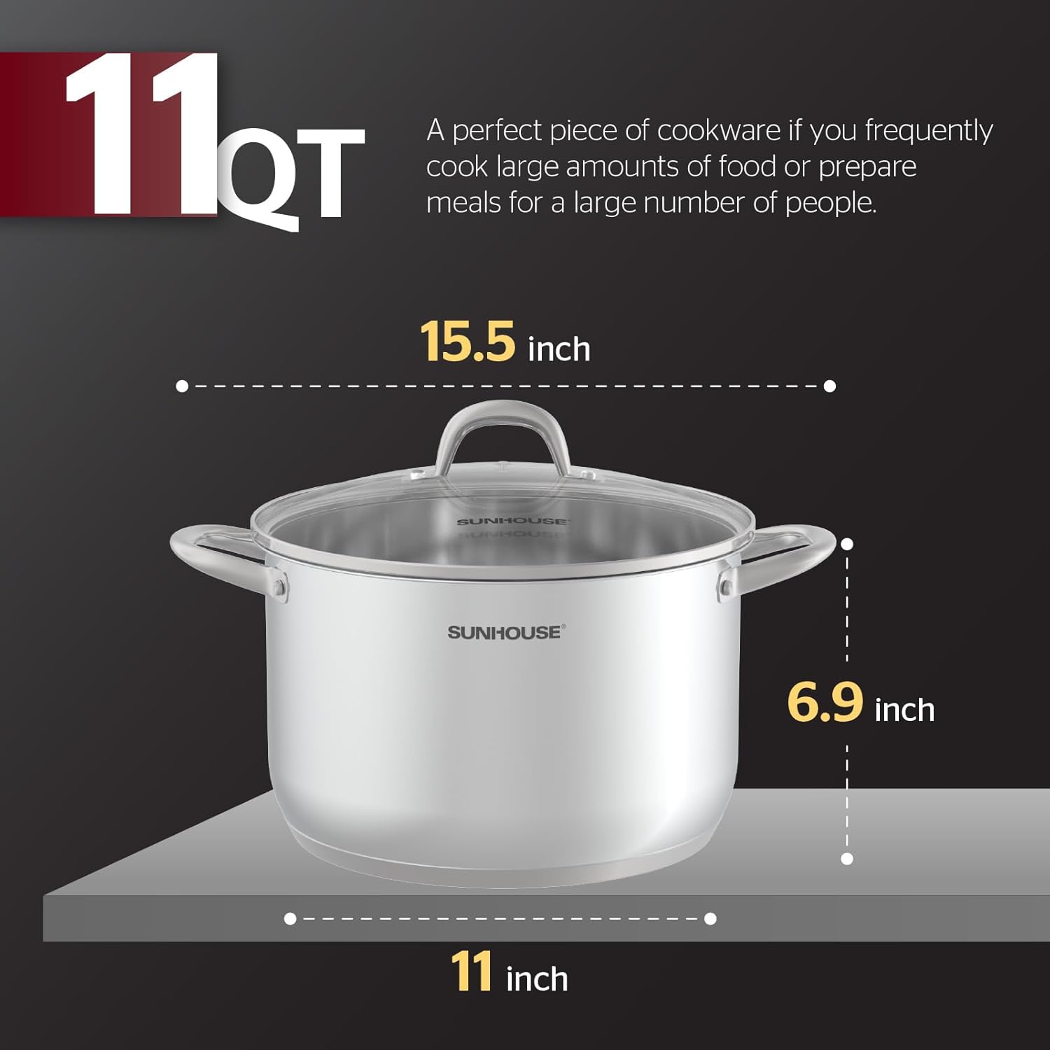 Sunhouse Stainless Steel Stock Pot - 11 Quart Heavy-Duty Induction Cooking Pot with Visible Lid for Pasta, Soup, Spaghetti - Nonstick Thick-Bottom Deep Stockpot for Canning, Boiling, and Simmering