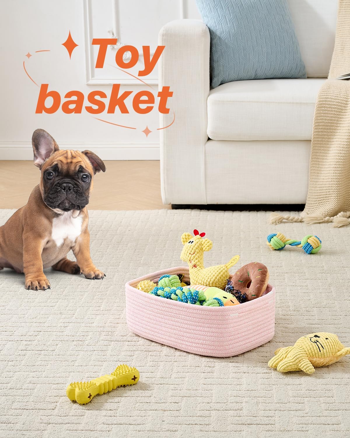 Small Woven Basket, 12 x 8 x 4.5 Inches, Storage Basket for Organizing, Cute Small Rope Shelf Closet Cube Storage Bins Baskets for Shelves, Dog Toy Gift Baskets Empty, 3 Pack Light Pink