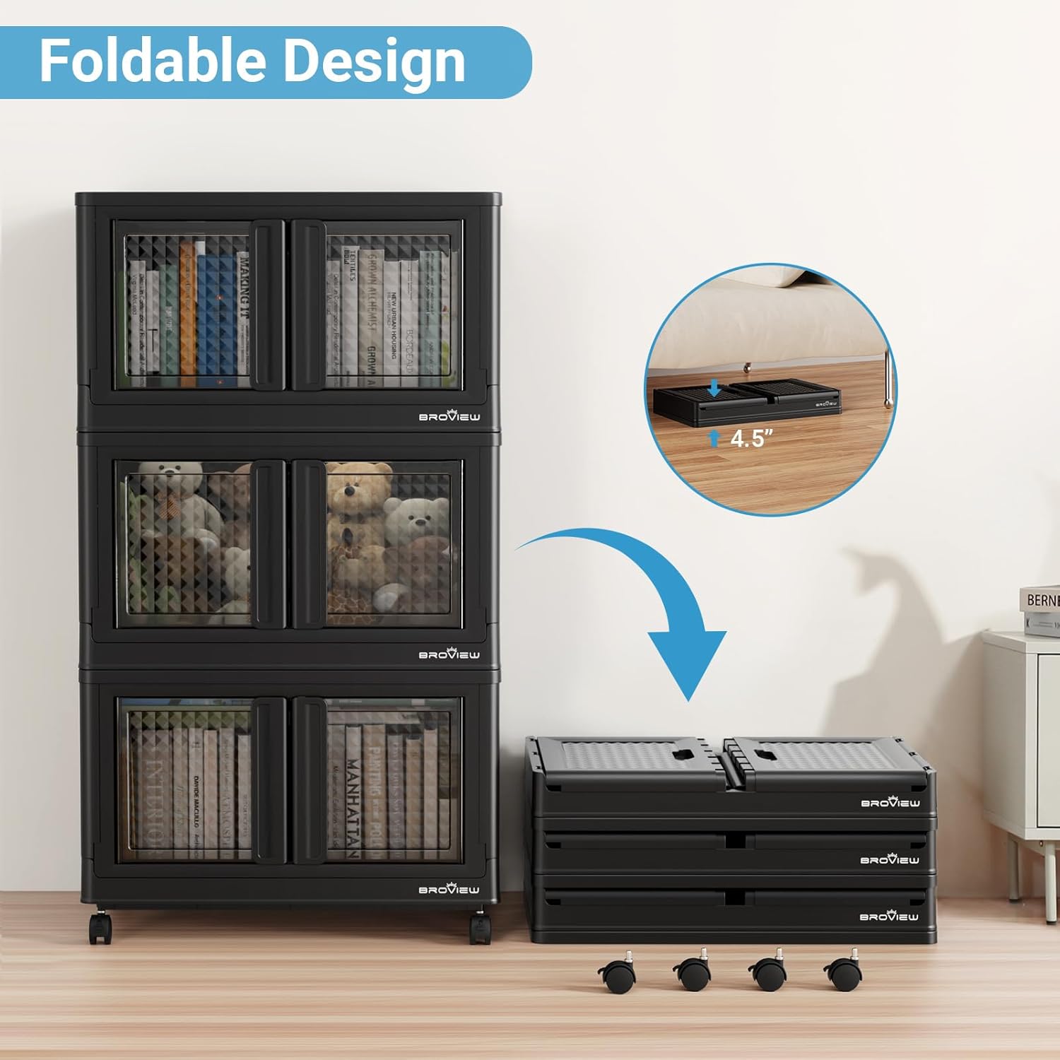 600Qt Stackable Storage Bins with Lids, 150Gal Closet Organizers and Storage Drawer, Plastic Collapsible Storage Bins with Doors, Heavy Duty Store Box Cabinet for Home Office, 6 Pack Black