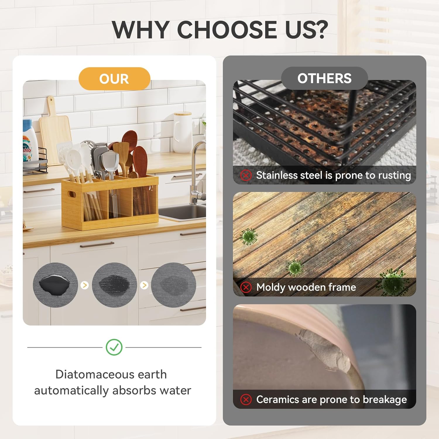 Yofidra Bamboo Utensil Holder & Silverware Organizer: Extra Large Cooking Holder with Absorbing Drying Stone and 6 Compartments Kitchen Countertop Storage Farmhouse Decor Accessories 11.8"X4.7"X5.9"
