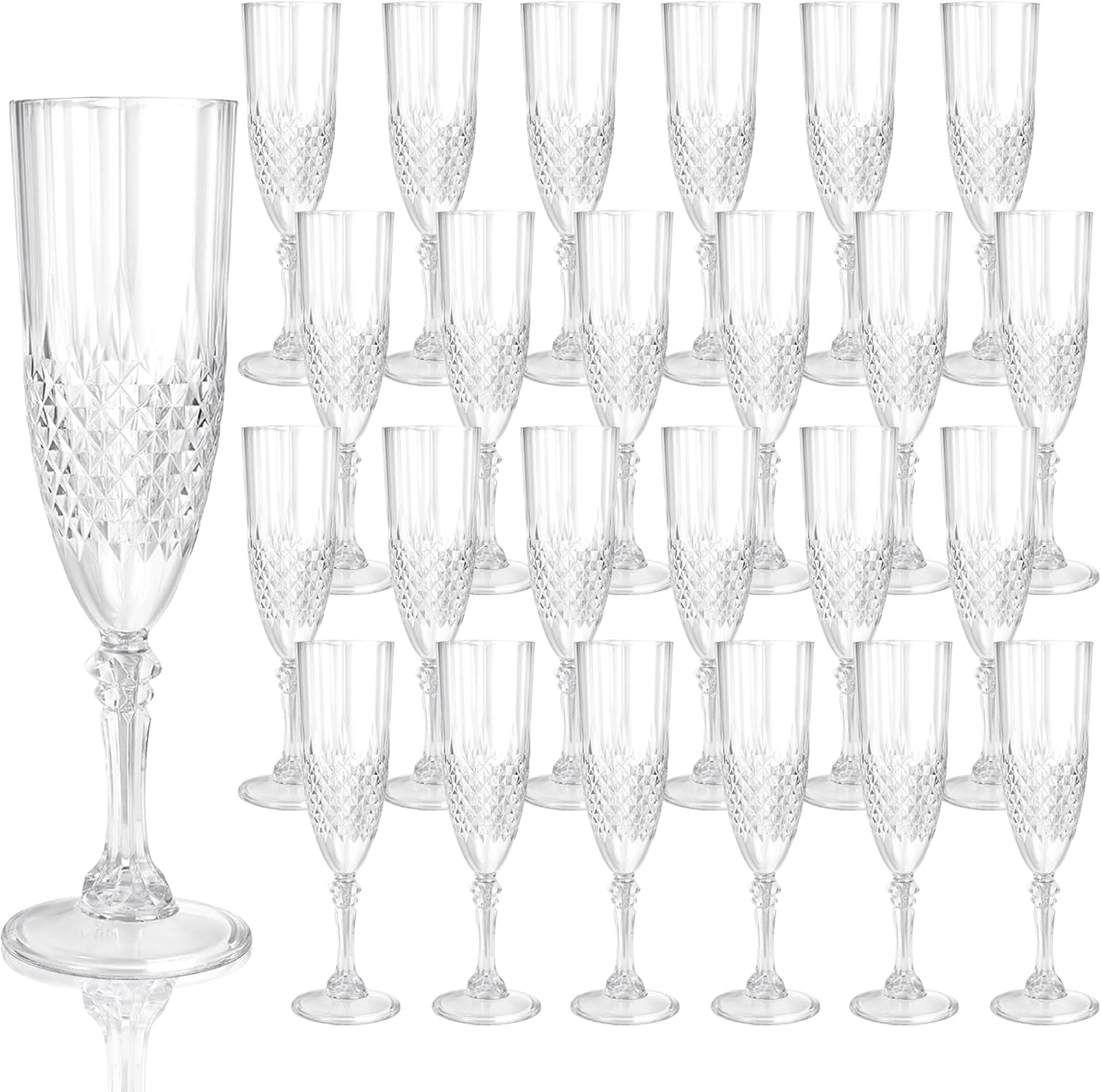 - Charming Set: Champagne flutes set include 24 retro-style transparent champagne plastic wine glasses, providing ample quantity to meet your daily use and replacement needs. A suitable champagne cup is the icing on the cake. Plastic wine glasses not only carry the wine, but also carries the laughter and blessings
