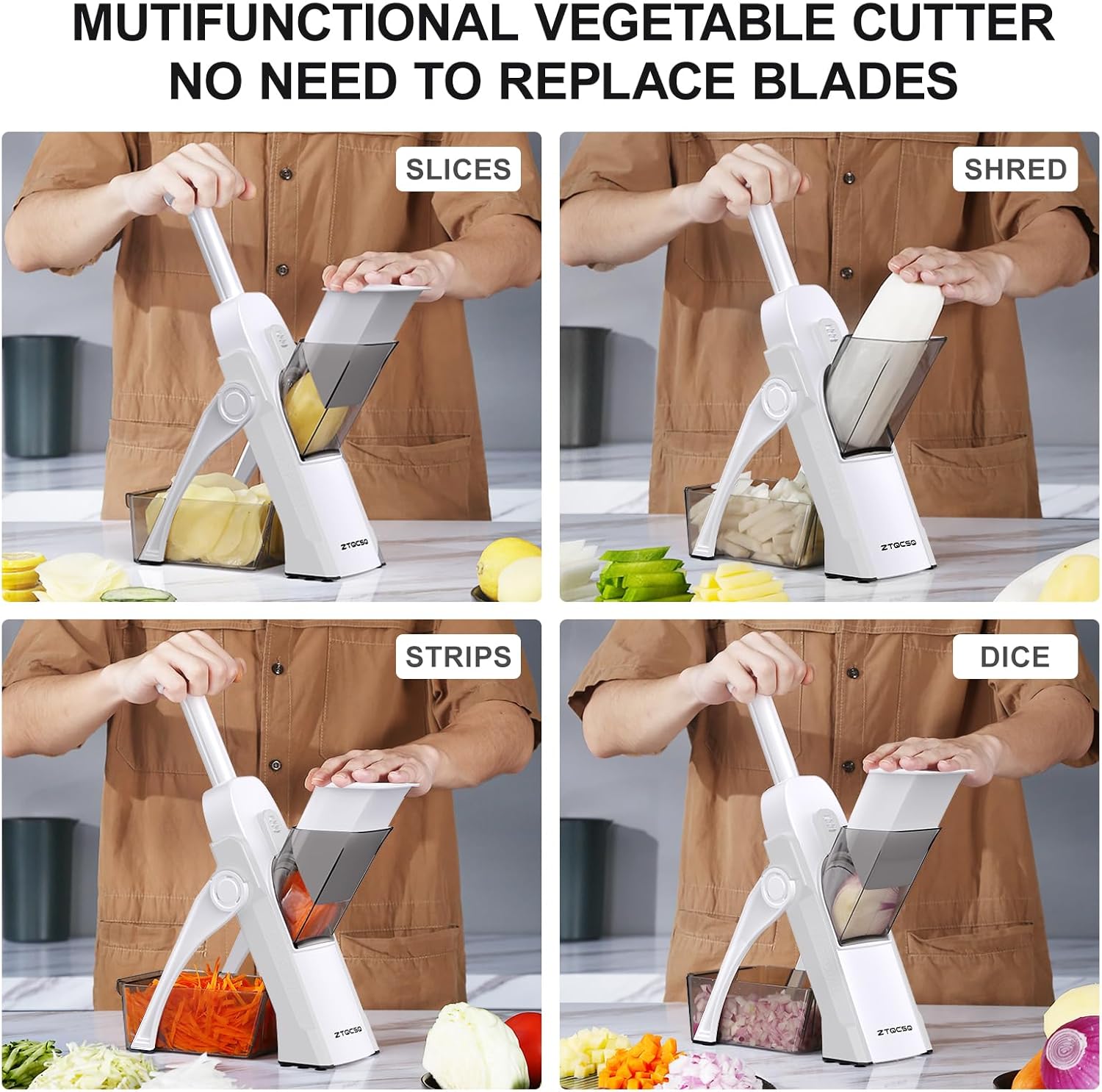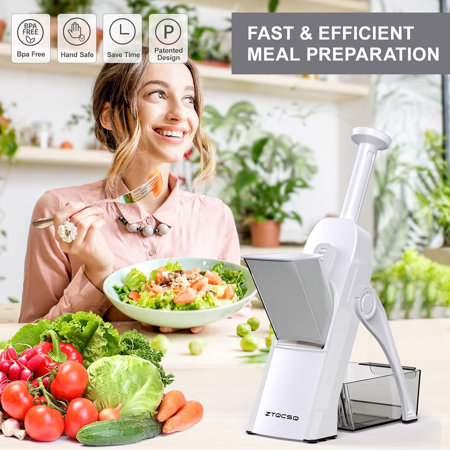 - 2. Professional Vegetable Chopper with Adjustable Thickness: The ZTQCSQ Mandoline Slicer eliminates the need for blade changes. With adjustable thickness settings from 0.1 to 8mm, it’s perfect for quickly slicing potatoes, carrots, cucumbers, onions, and more. The durable, easy-to-use blades are designed to last, making home cooking faster and more efficient.