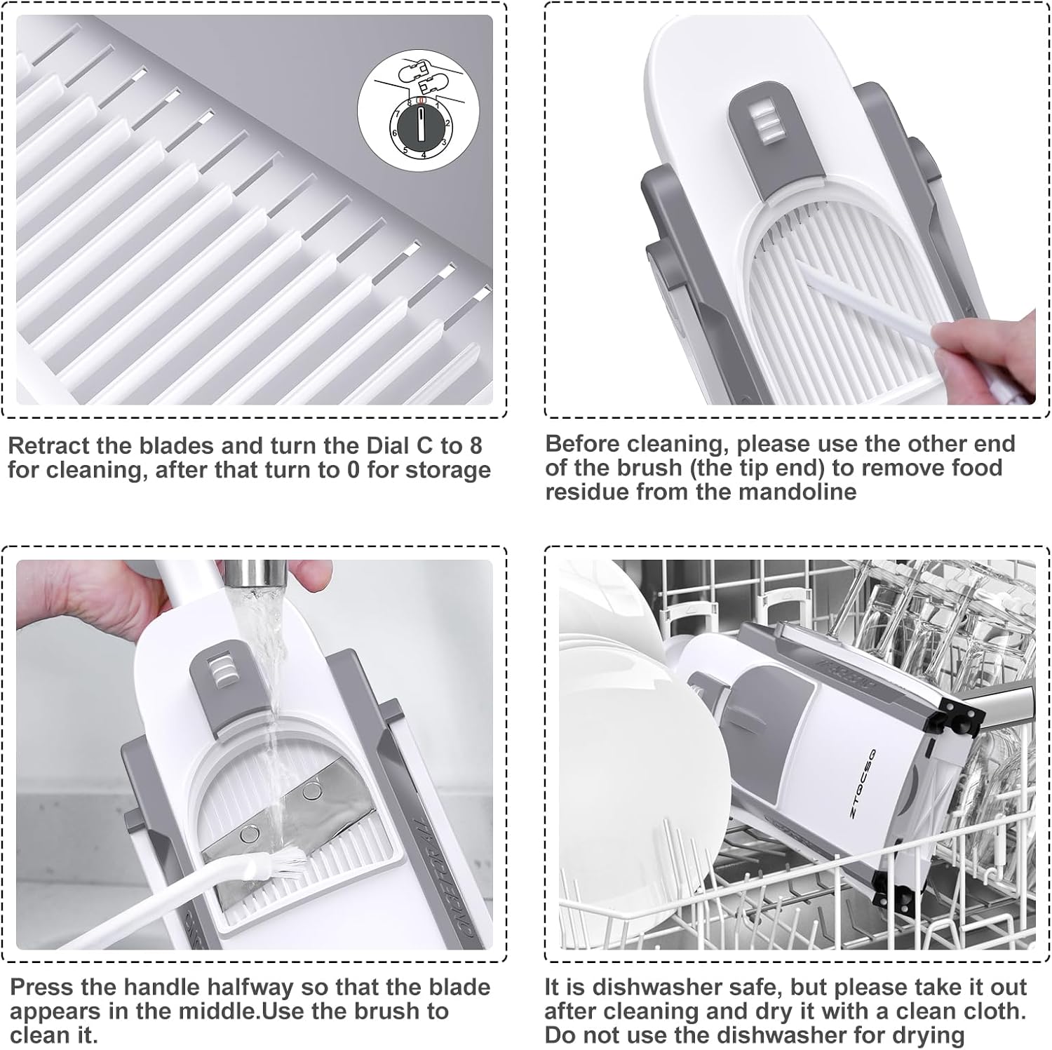 - 4. Easy to Use and Clean: Whether you’re preparing a quick breakfast or saving time on salads, this mandoline slicer simplifies your tasks. Its foldable, compact design takes up minimal cabinet space, and the included brush makes cleaning the blades effortless. It’s also dishwasher-safe for added convenience.