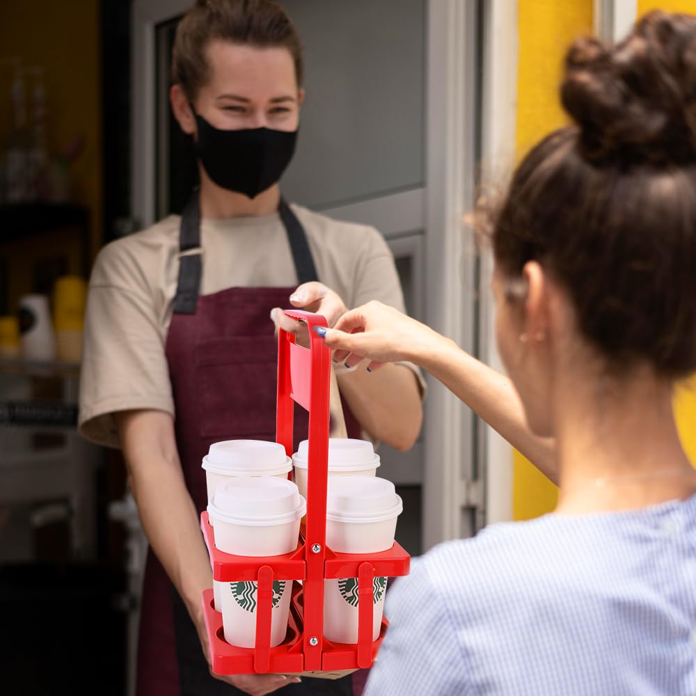 Bodaon 4 Cup Drink Carrier with Handle, Plastic Cup Carriers for Drinks, Drink Holder for Car, GrubHub/Eats Doordash Accessories, Portable Foldable Reusable Mobile, Use for Food Delivery Bag, Red
