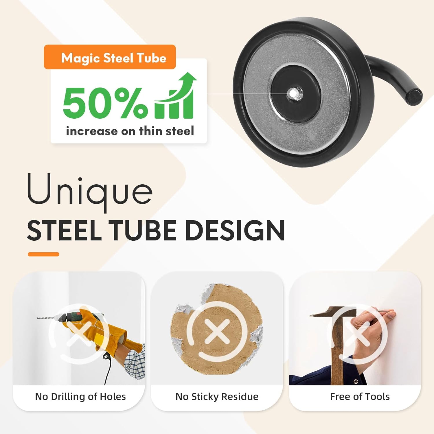 - 50% MORE HOLD ON THIN STEEL — STEEL-TUBE BOOST: Unique steel-tube design concentrates magnetic flux for about 50% more holding power vs standard magnet hooks, especially on thin metal cruise doors/walls. These heavy duty magnet hooks stay put—no slipping, no tools, no drilling.