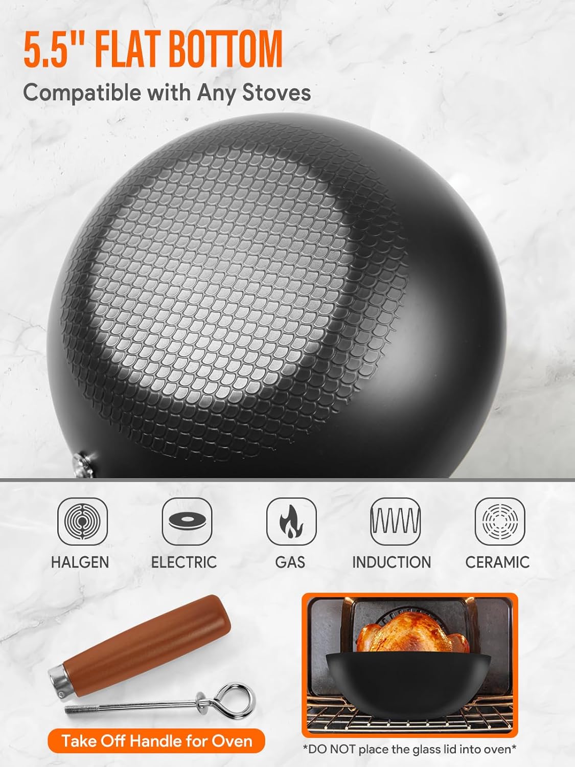 - ăQUALITY GLASS LID & WOODEN HANDLEăTo complete the package, this wok set comes with a quality glass lid that allows you to monitor your cooking without losing heat or moisture. The wooden handle provides a comfortable and secure grip, ensuring that you can maneuver the wok with ease and confidence.