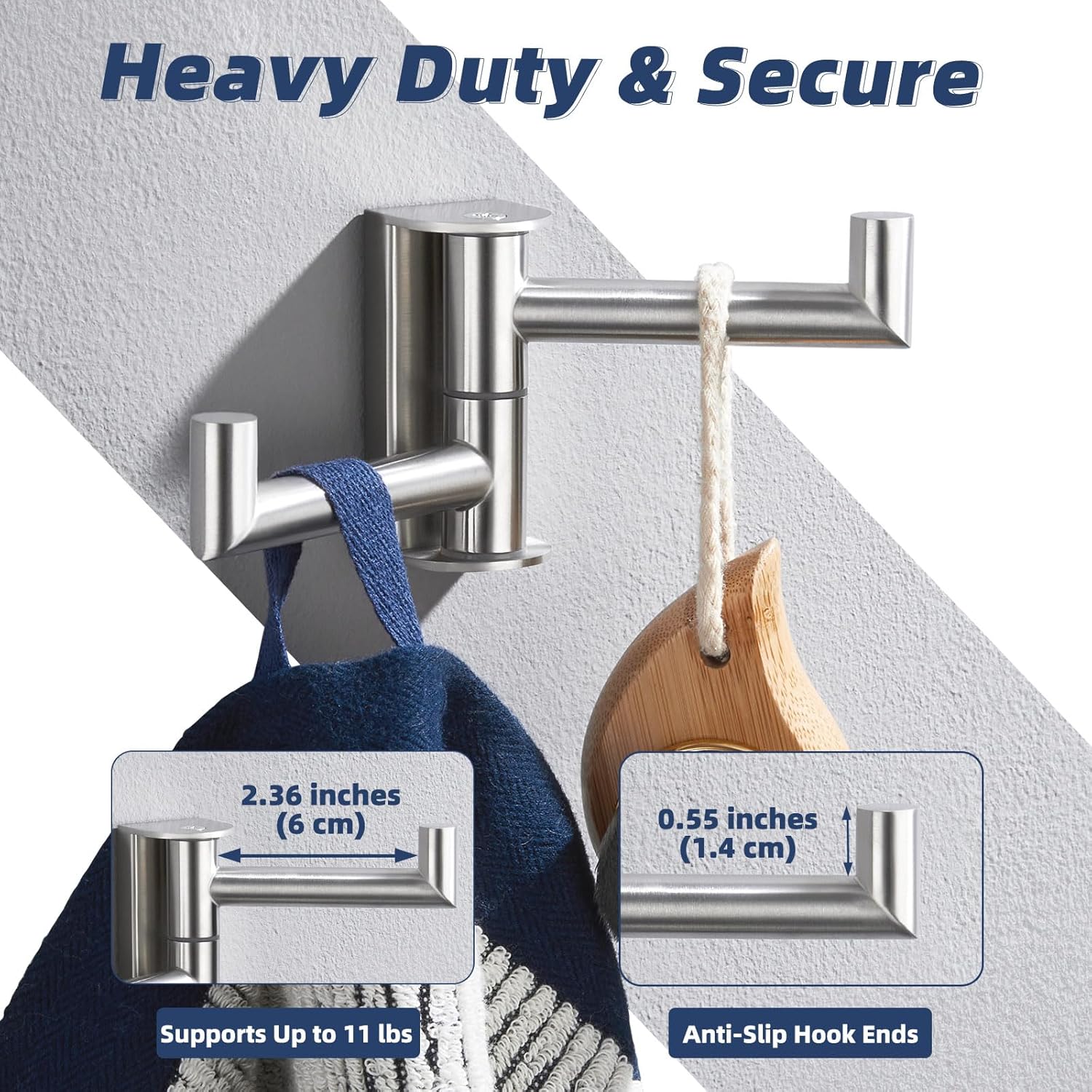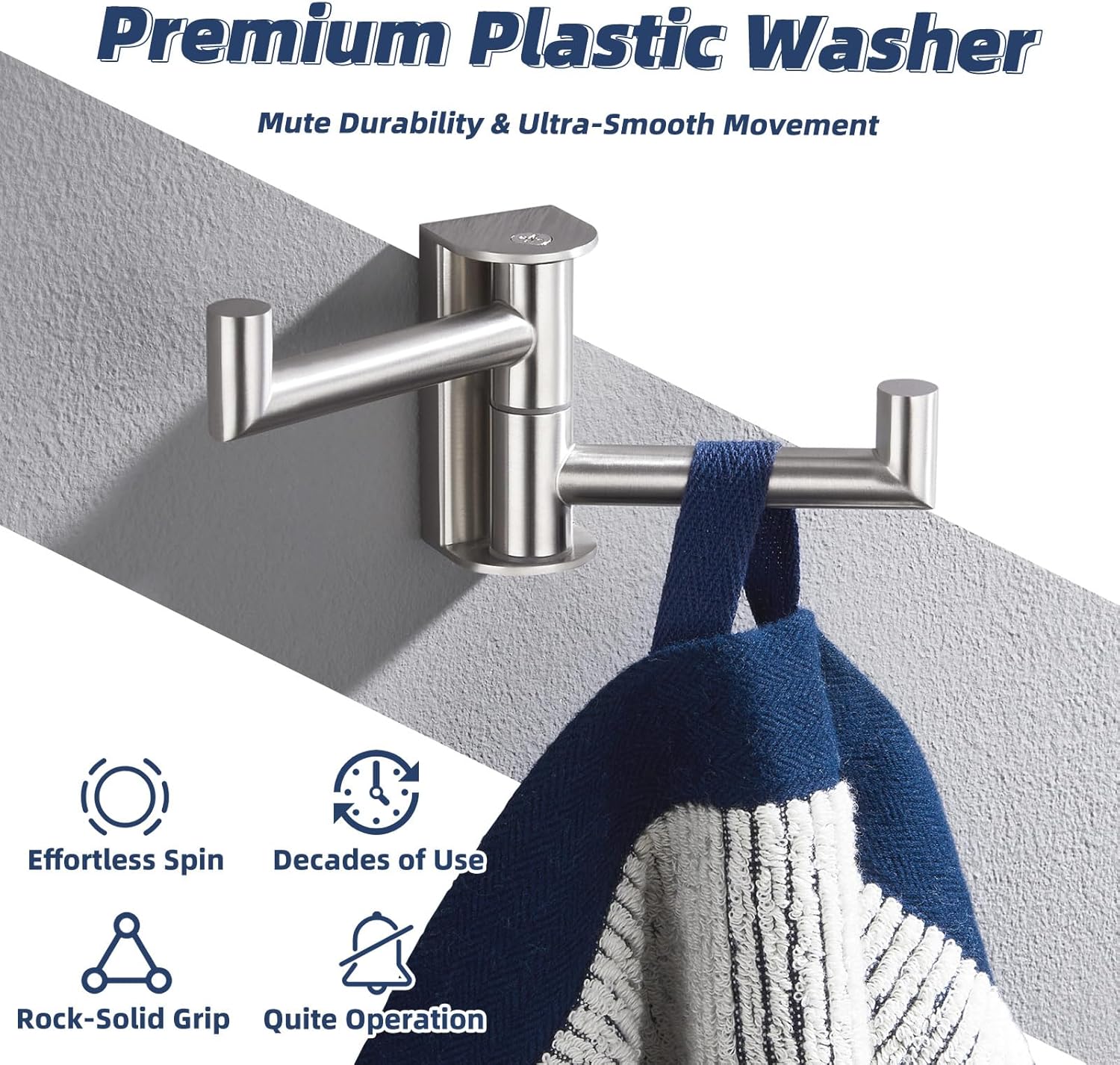 - SOLID CONSTRUCTURE: 304 stainless steel bathroom towel hook is built to last with rustproof properties, suitable for indoor or outdoor use. Each rod is connected by quality plastic gasket, reduce metal wear when rotated, ensure silence