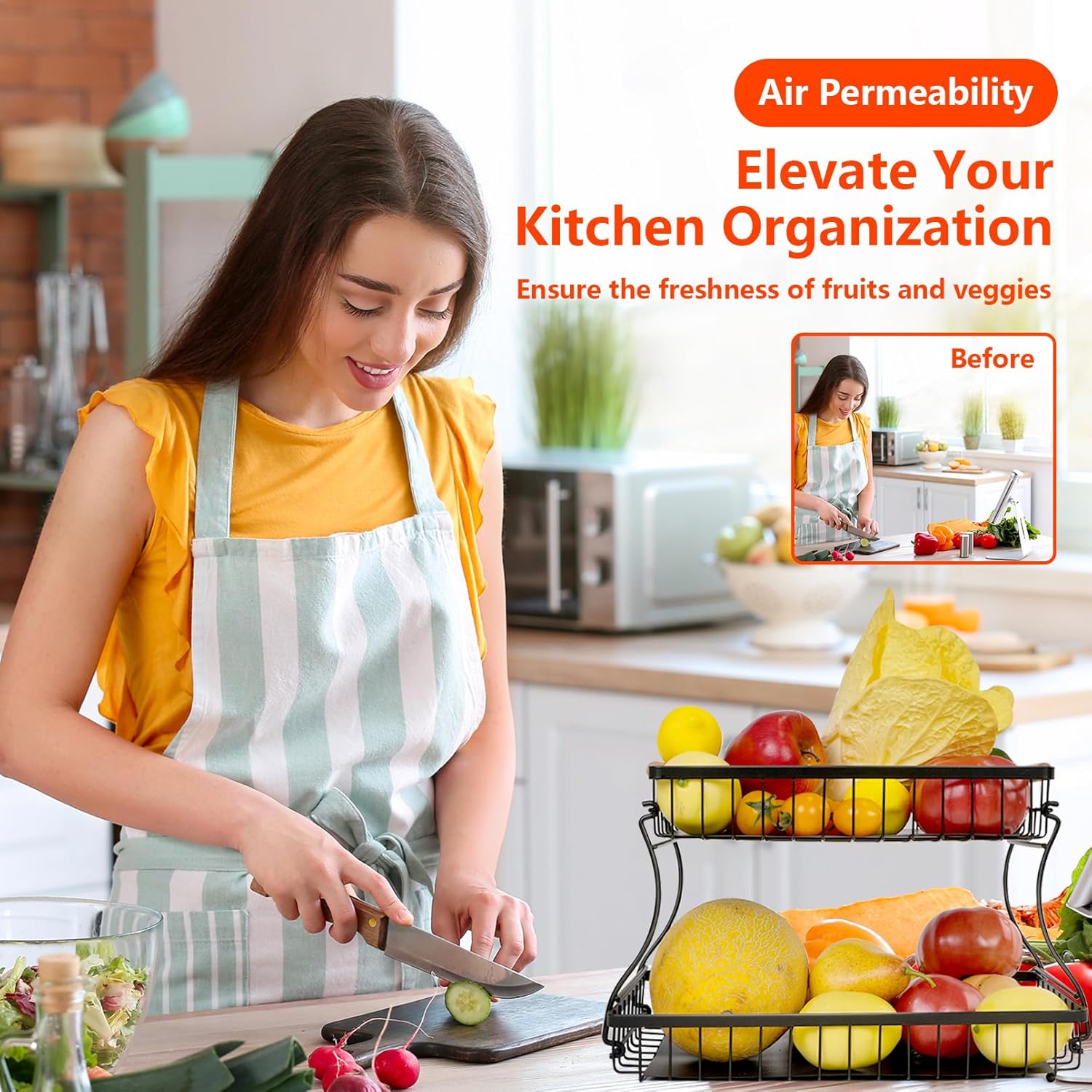 - ā "Metal two tier fruit basket with ergonomic Wood Handles - Comfortably carry heavy loads of citrus fruits and veggies to picnics, kitchens, or grocery stores"
