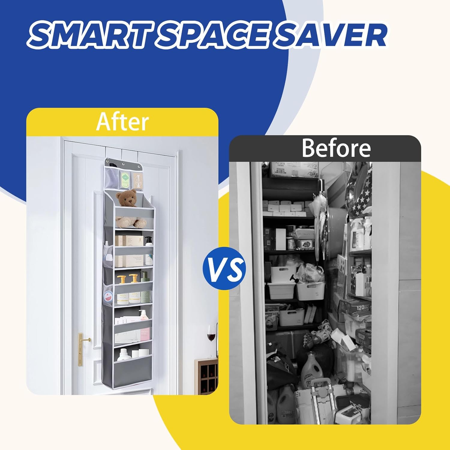 Over The Door Organizer - 6 Capacity Large Pockets & 7 Mesh Compartments, Anti-Tilt Design Holds 44 lbs, for Bathroom, Nursery, Dorm, Pantry & Laundry Storage (Light Grey)