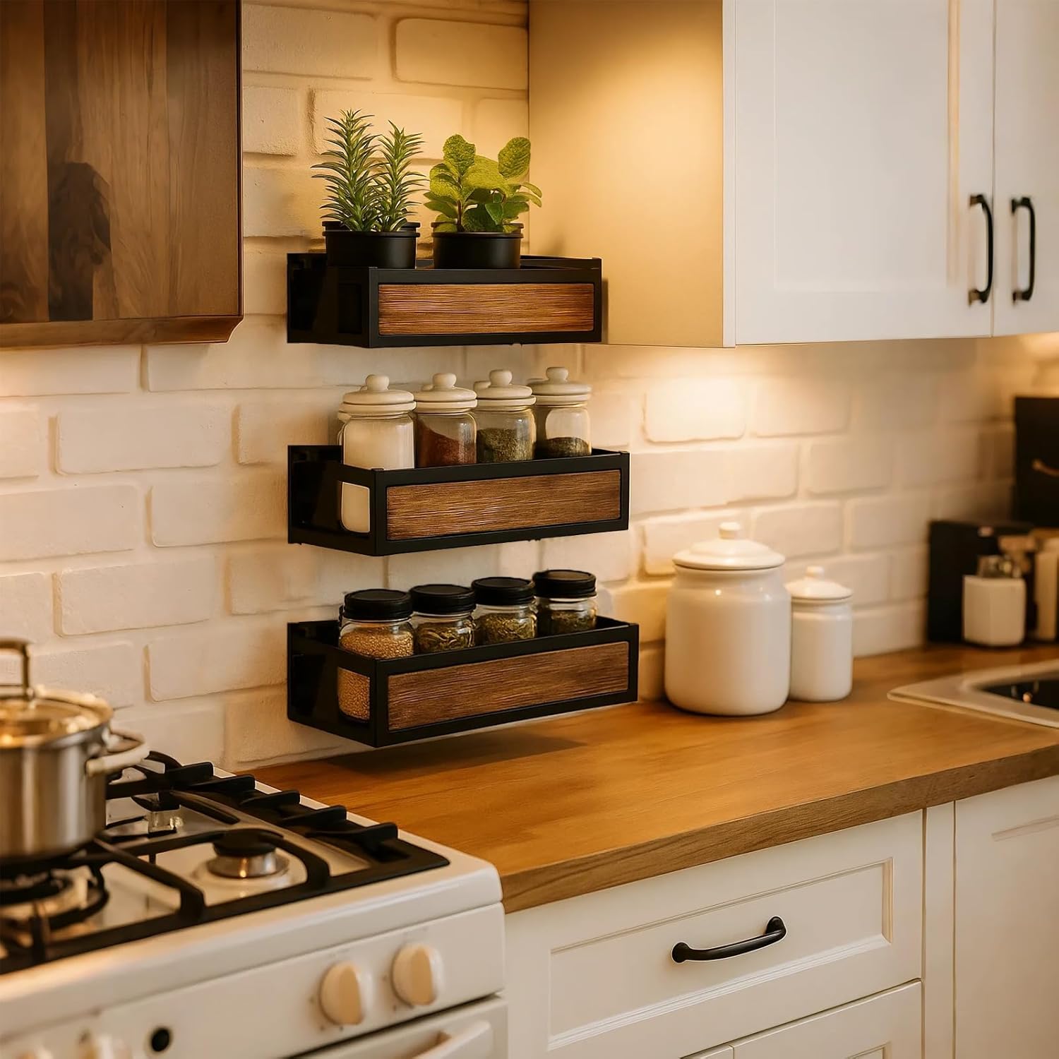 Spice Rack Wall Mount 3 Pack, Space-Saving Seasoning Organizer,Screw or Adhesive Hanging Spice Rack Organizer for Kitchen Cabinet and Wall (Engineered Wooden)