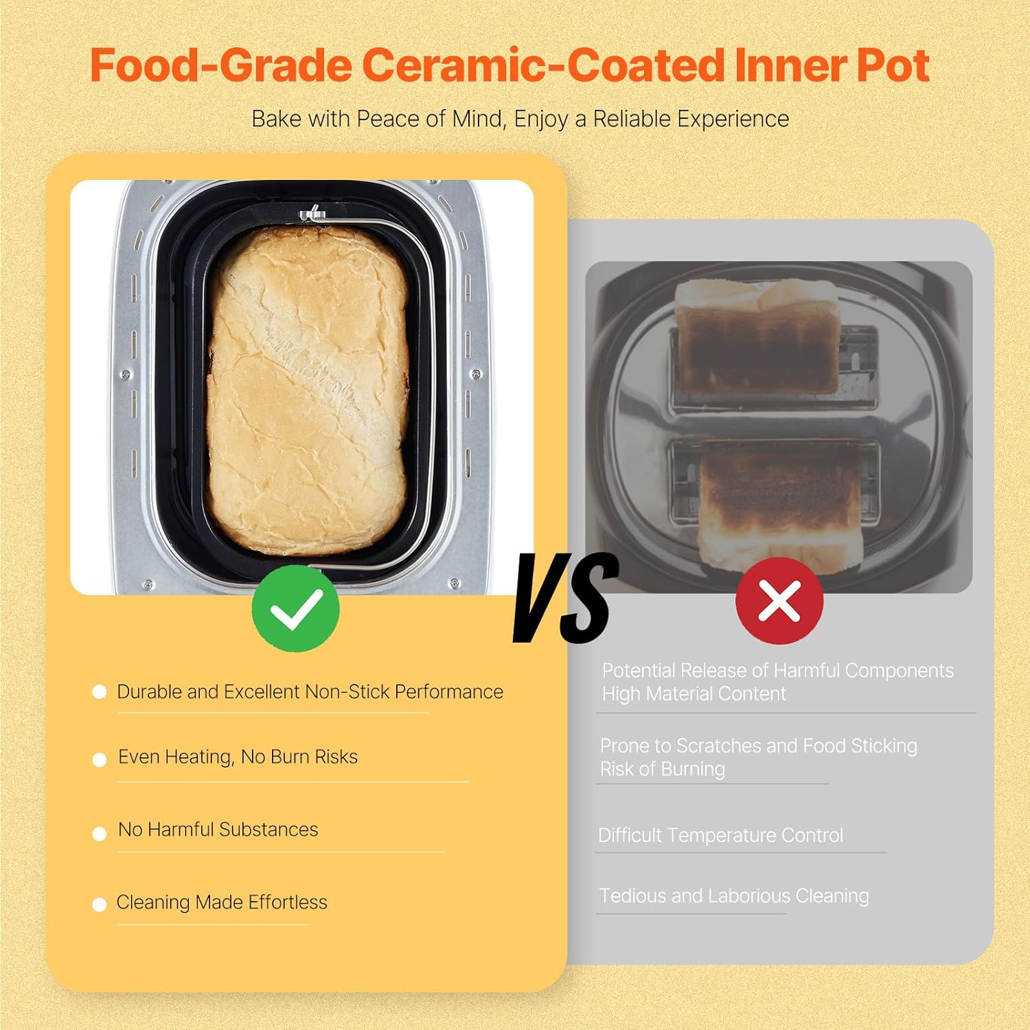 - Food-Grade Ceramic Inner Pot: The inner pot is vital for health and security. Our bread maker features a food-grade ceramic inner pot with high-temperature resistance, ensuring no harmful substances are released. Its durable, non-stick coating won’t peel, avoiding burn risks even with long-term use. The kneading blade is made of food-grade Teflon, ensuring security. Every step reflects our commitment to your health, delivering secure and delicious bread.