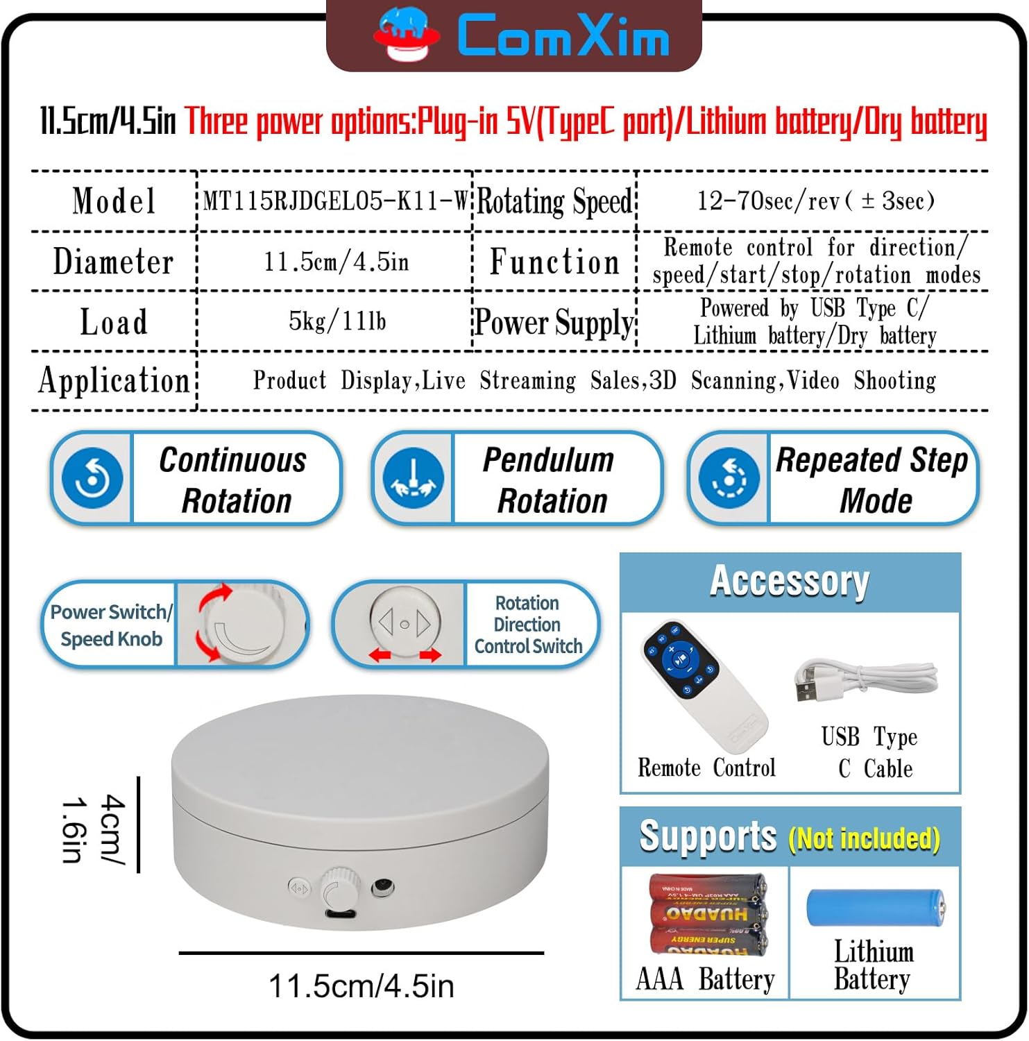 - 【Three Power Supply Options】: This 360 rotating display stand offers three power supply options: Type-C connection, 3 AAA batteries, or a pointed-head 18650 rechargeable battery, providing flexible power choices. Type-C power is ideal for indoor use, while batteries are suitable for outdoor or power-limited environments. <b>Note:</b> The display turntable package does not include the required AAA batteries or 18650 lithium batteries. Both AAA batteries and 18650 lithium batteries are sold separately.