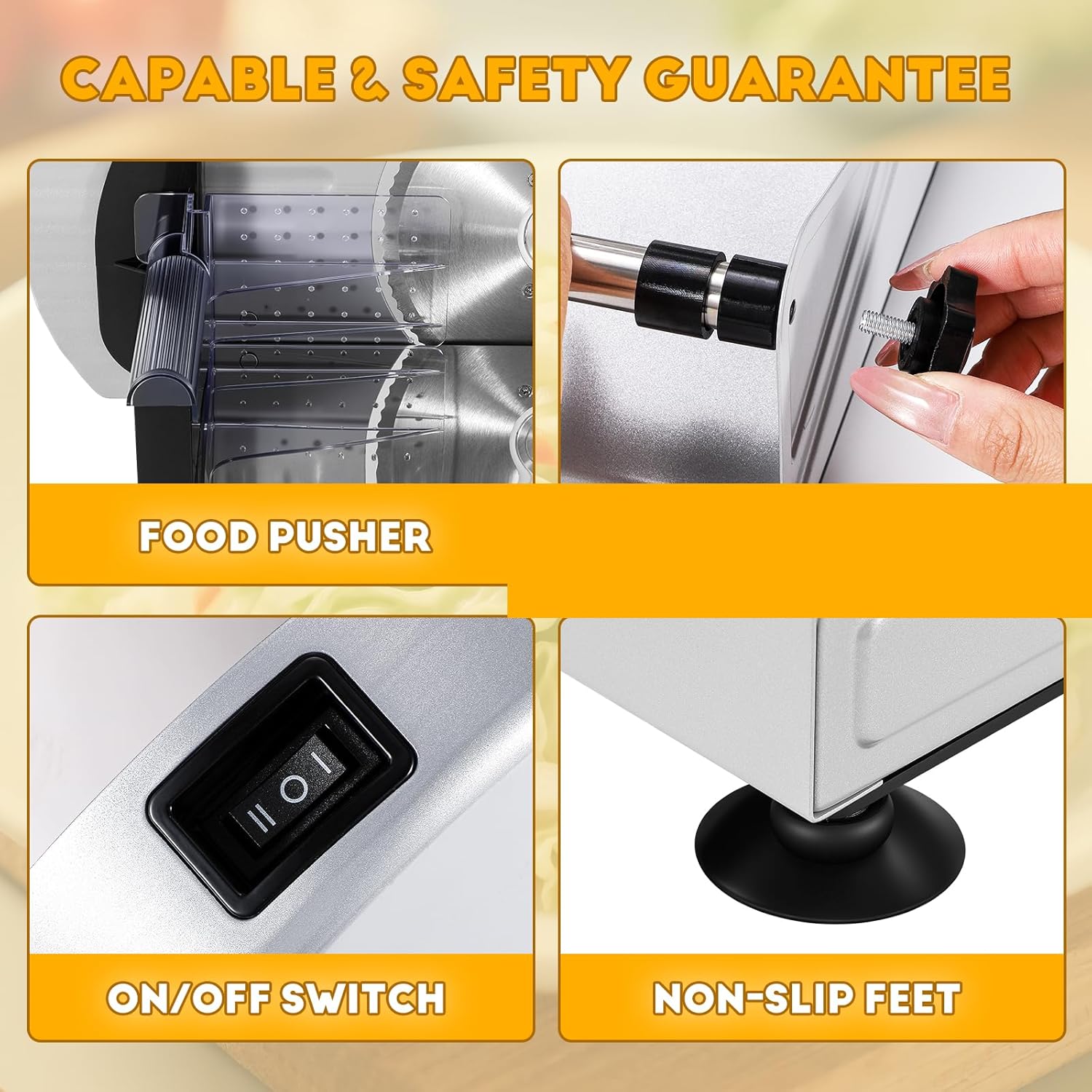 - Perfect Design: The Electric Slicer is made from premium-quality die-cast aluminum, which is not only super-durable, but also rustproof and easy to clean. Non-slip suction cup feet keep the Deli Slicer stable while working, and the food pusher also acts as a blade guard to help keep your fingers safe. The on/off switch provides added safety. With its compact design, this Deli Slicer is small enough for most cabinets and countertops.
