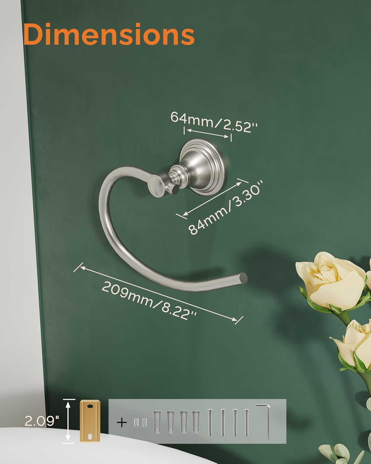 - [Easy to Install] The bathroom hand towel holder includes all the necessary accessories and instructions for installation, making towel ring wall mounted easy for anyone to complete the installation