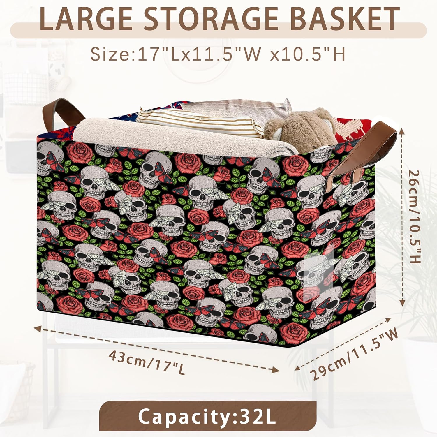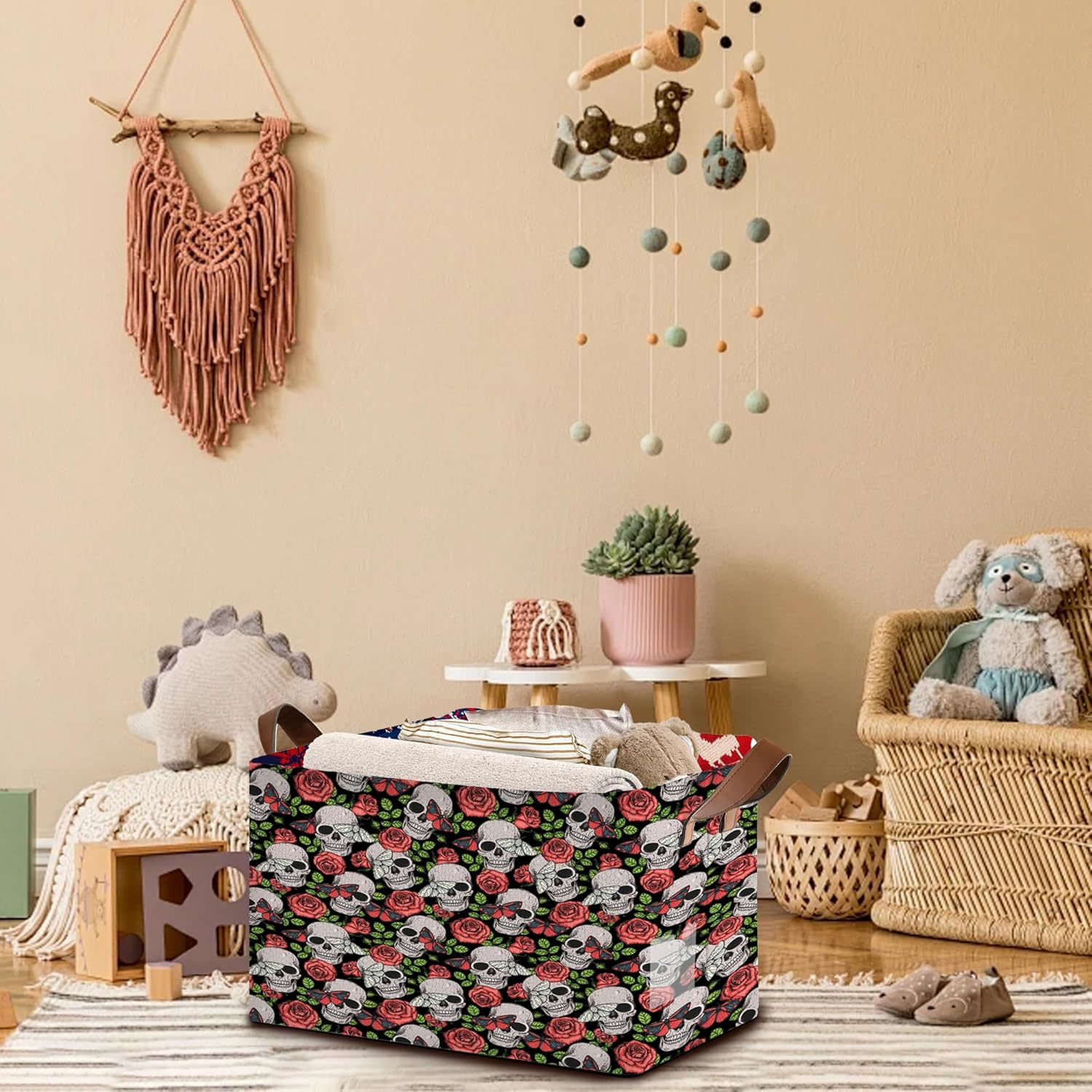 Skull Flower Pattern Collapsible Storage Bin-17x11.5x10.5 Inch Foldable Organizer for Halloween Decor, Gothic Room, Under Bed Storage-Single Pack