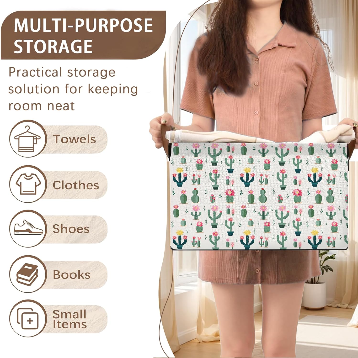 Desert Bloom Storage Basket Large 17x11.5x10.5 Inche-Collapsible Fabric Organizer Bin with Handles for Southwest Decor, Nursery, Boho Style-Decorative Hamper with Succulent & Flower-Single Pack
