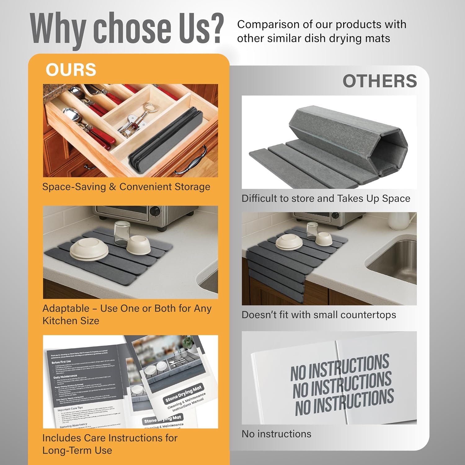 - Clean Surface, Low Maintenance: No need to worry about fabric that stays damp. The smooth surface of this absorbent dish drying mat wipes cleans in seconds. For deep refresh, use the included sanding disc and a detailed instruction manual with care tips to help you keep your mat clean, effective, and long-lasting. Ideal for families who want a more hygienic, cleaner-looking solution near the sink or in the bathroom.