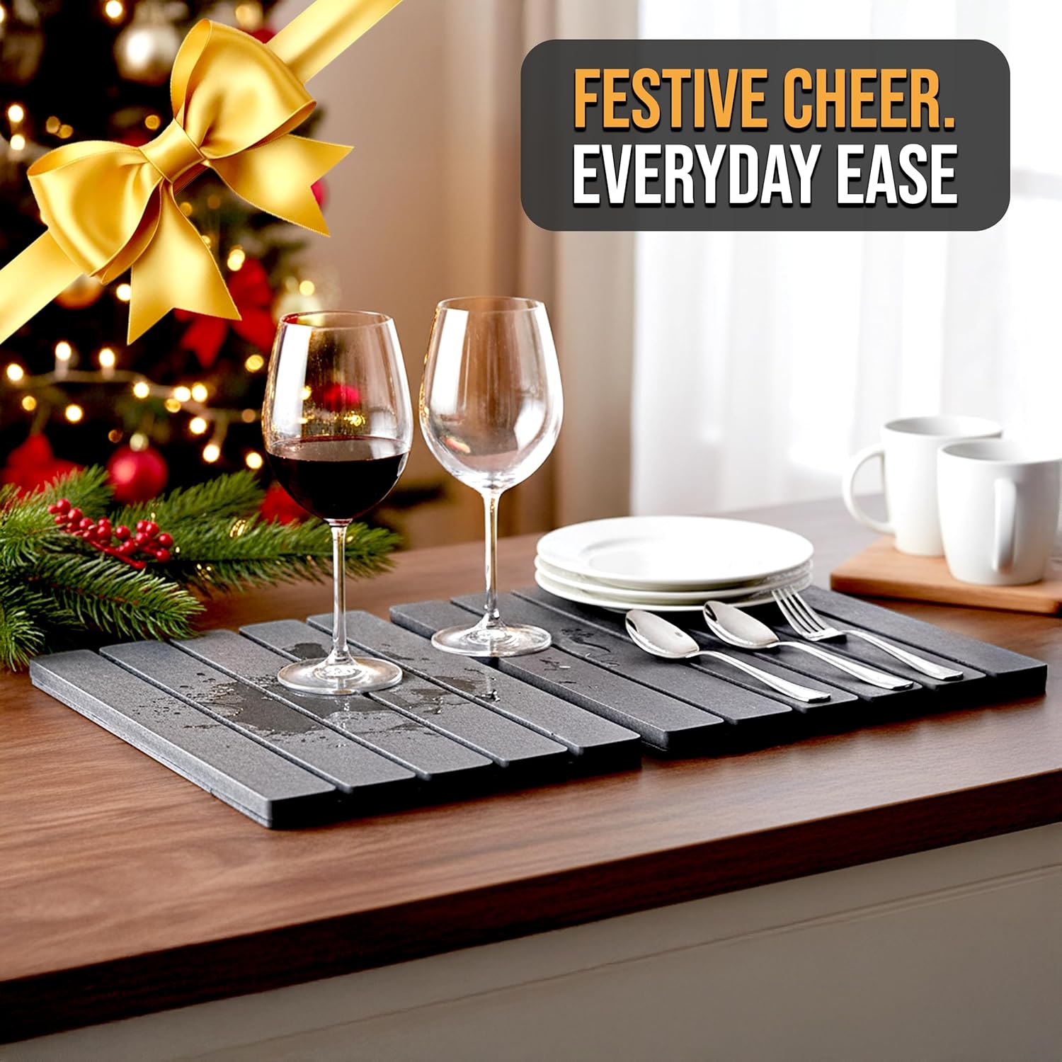 - Durable & Stable on All Counters: Built with five durable stone tiles bonded to a flexible backing, this drying mat for kitchen counter stays stable thanks to the included non-slip pad. It’s sturdy enough to hold dish racks, glassware, or pots. Fits beautifully on any surface—quartz, granite, wood—and adds a premium touch to your kitchen or bath.
