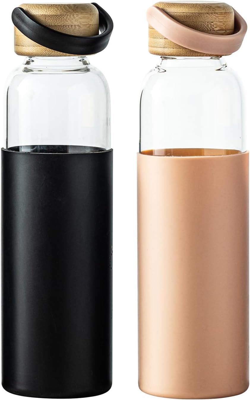 21oz Borosilicate Glass Water Bottles with Silicone Non-Slip Sleeve & Leak-Proof Lid-Reusable Drink Bottle for Office,Travel,Gym,Hiking-BPA Free,Ideal Gift for Home,Car &Fitness (Pink+Black)