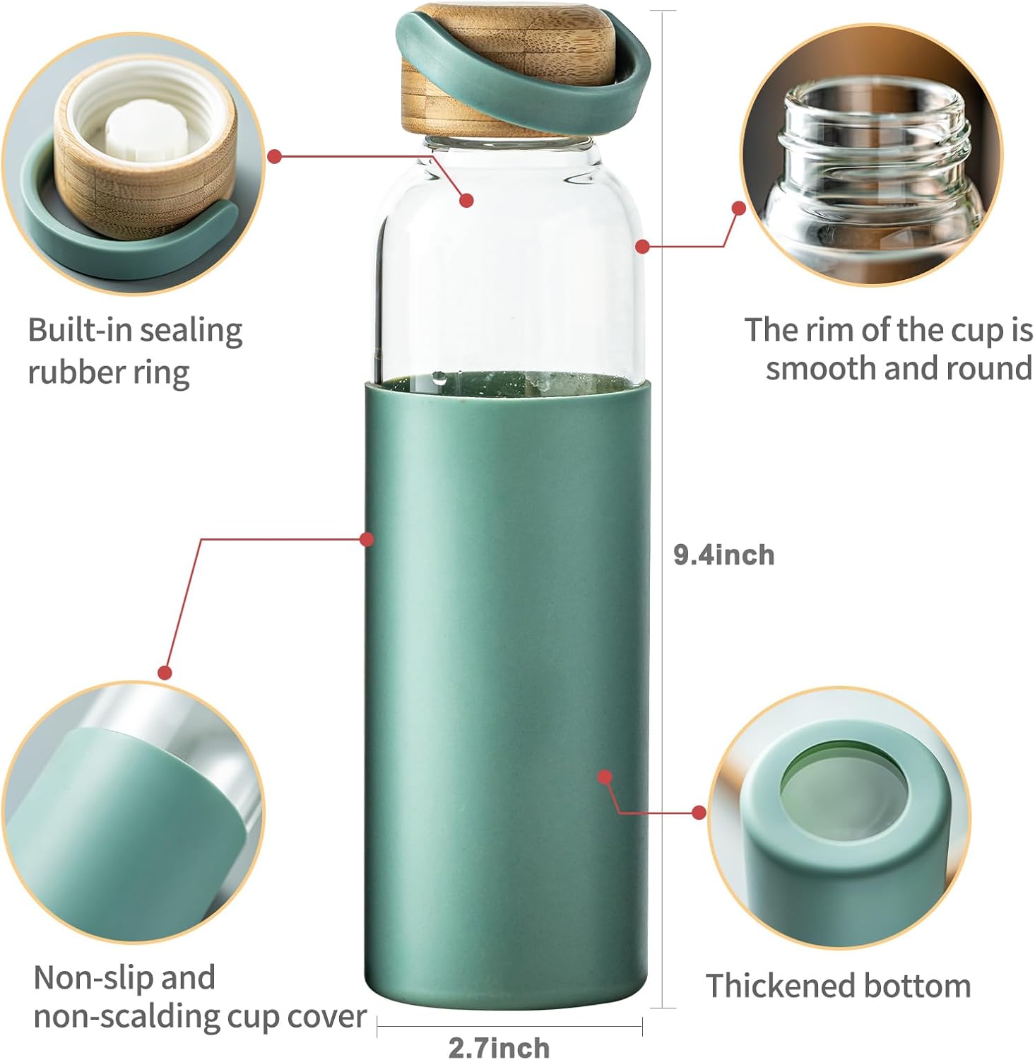 21oz Borosilicate Glass Water Bottles with Silicone Non-Slip Sleeve & Leak-Proof Lid-Reusable Drink Bottle for Office,Travel,Gym,Hiking-BPA Free,Ideal Gift for Home,Car &Fitness (Green)