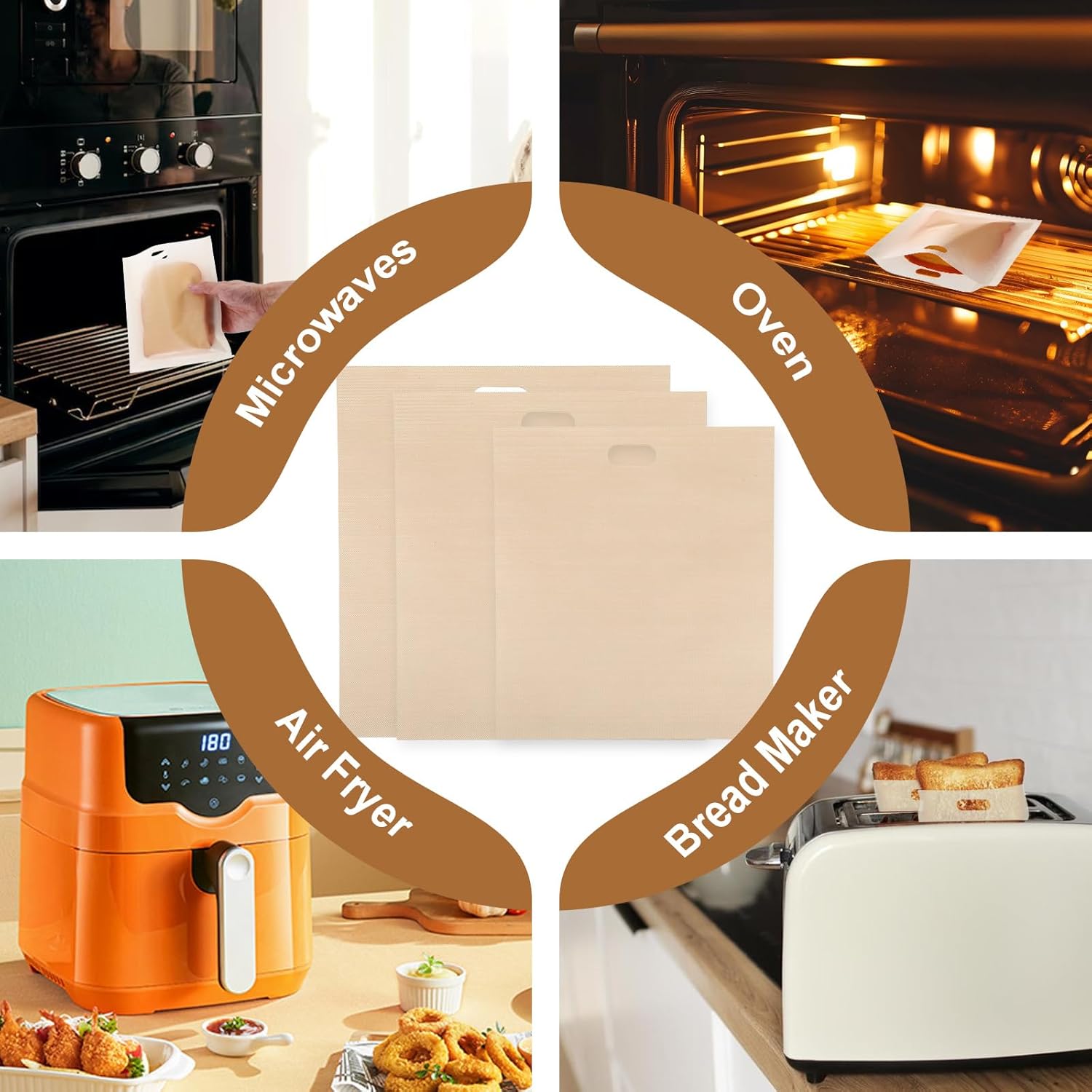 - 【Widely Used】These toaster bags are heat resistant up to 250℃, perfect for the microwave, oven, or grill, allowing you to quickly cook a grilled cheese sandwich, or heat a slice of pizza, some chicken at home or in the office.