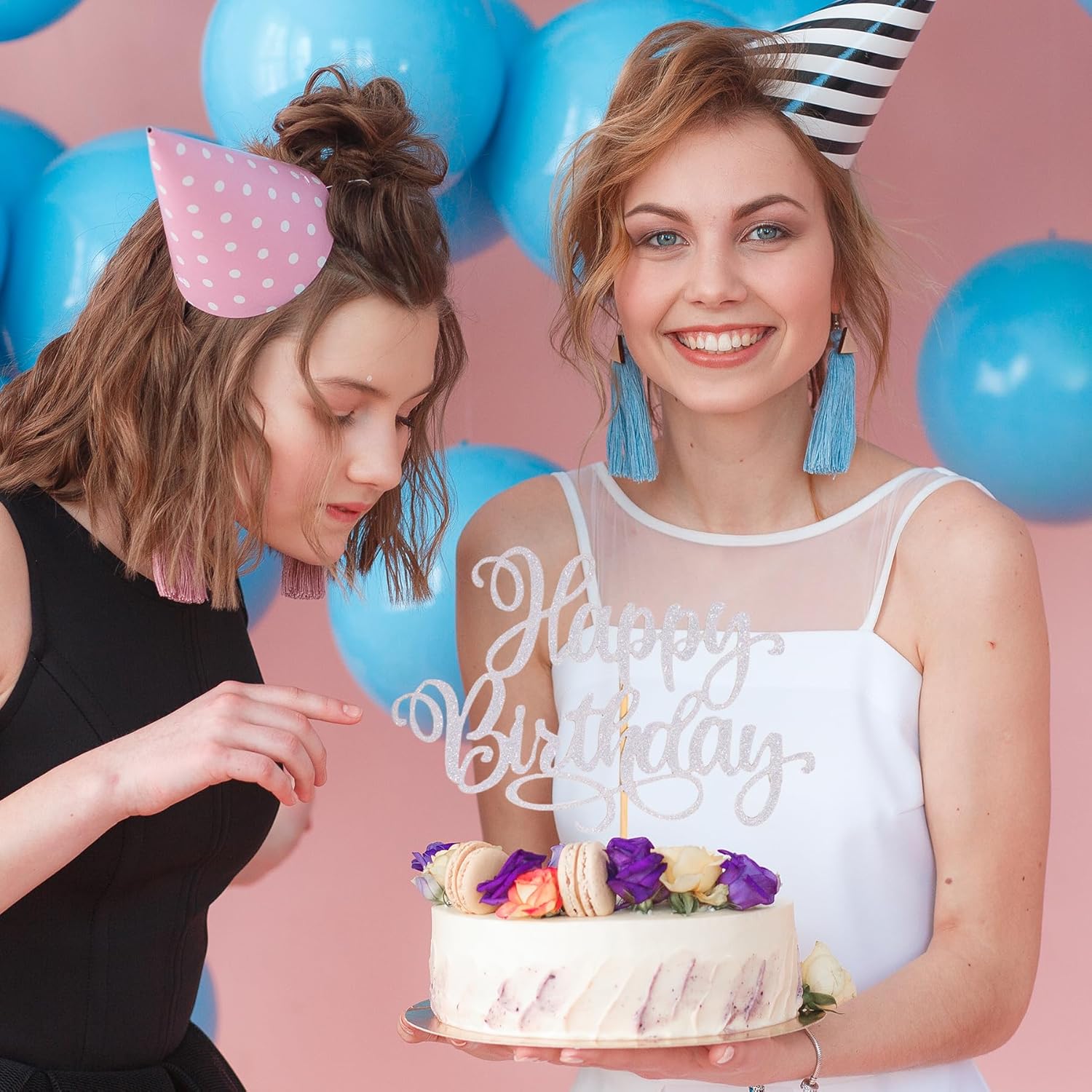 Happy Birthday Cake Toppers 9 Inch Glitter Happy Birthday Cake Pick for Birthday Anniversary Theme Party Cake Decorations Supplies - Silver