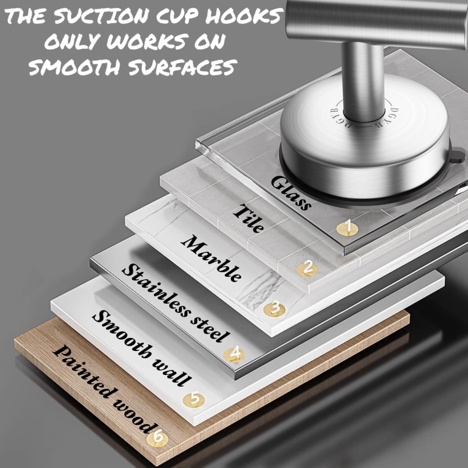 - Bathroom towel hook only fix to smooth, clean, flat and non-porous surface, shower hooks suction cup perfect for glass, mirror, smooth tiles, stainless steel, plastic, acrylic, cultured marble, smooth polished metal etc, suction hooks for shower wall cannot be used on rough surface or cement lime walls, wallpaper, non-painted wood, mosaic.