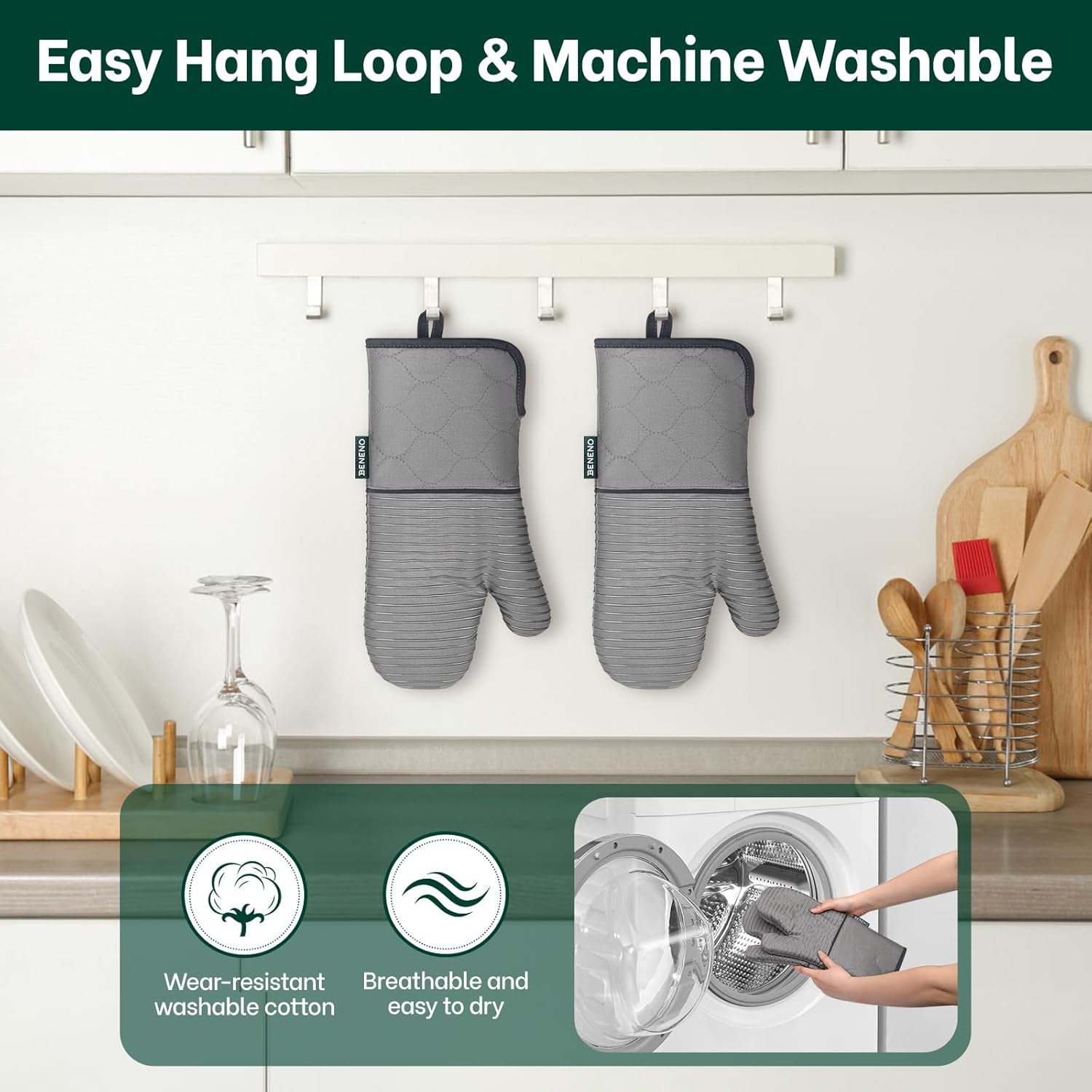 - Easy to Care & Easy to Store: Designed for busy kitchens, these oven mitts are completely machine washable to maintain freshness after long term cooking use, the built-in hanging loop provides instant organization, keep them within reach while adding a stylish touch to your kitchen decor