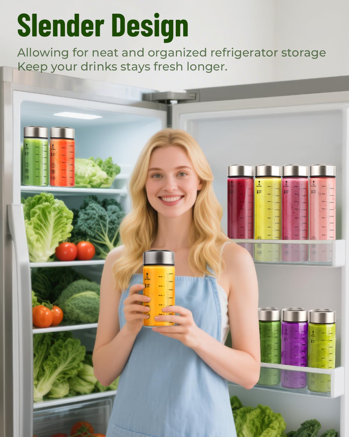 - SLEEK AESTHETIC DESIGN AND DISHWASHER SAFE: The slim, skinny, compact, lightweight and portable design glass bottles fits perfectly in your hand, means you can travel with and take your glass juice jar with cap everywhere, perfectly for garden parties, homemade drinks, picnics, school, work, gym, fitness, yoga. Easily store in the fridge, backpack or car cup holder, convenient for using at home, in the office, outdoors and on-the-go.