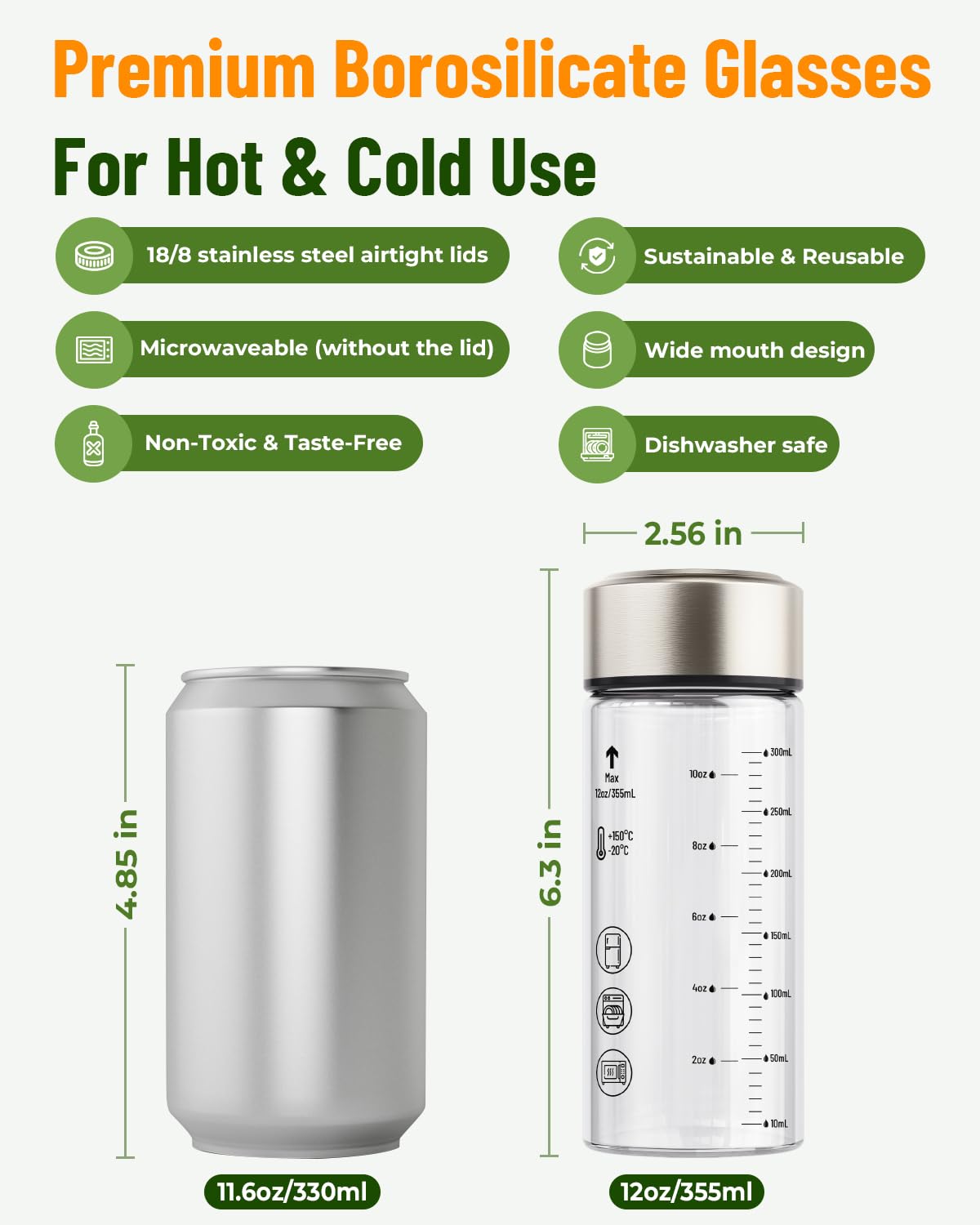 - GLASS WATER BOTTLES WITH MEASUREMENT MARKER: Durable stainless steel lids with air and water-tight seals, so it is completely airtight to keep your beverage fresh without any worry of spills. Throw this small glass water bottle in your bag or car and get a healthy start to your day with a juice, brew, ice tea, iced coffee, nut milk, milkshakes, kombucha or protein. The clear glass helps you quickly spot the drink you're in the mood for.